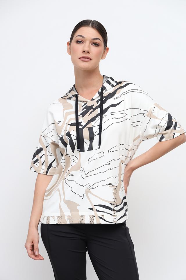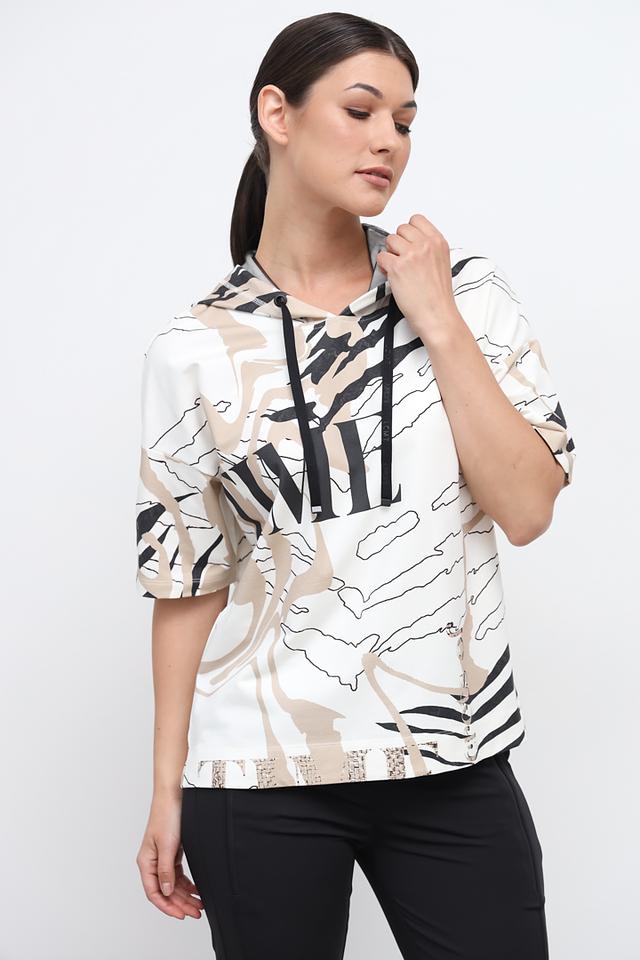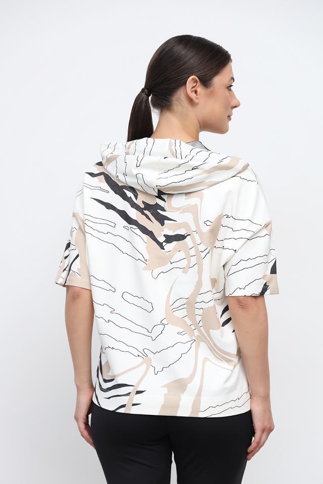 Женская футболка Lecomte бежевого цвета с оригинальным абстрактным принтом. Модель с коротким рукавом и капюшоном, выполненная из мягкого и приятного к телу трикотажа. Состав: хлопок 60%, вискоза 35%, эластан 5%