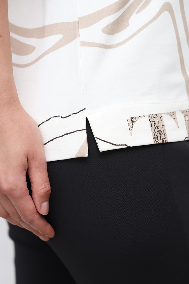 Особенностью данной модели является яркий и необычный принт в бежевых и коричневых тонах. Он придает футболке индивидуальность и делает ее отличным акцентом в вашем образе. Состав ткани: 60% хлопок, 35% вискоза, 5% эластан.