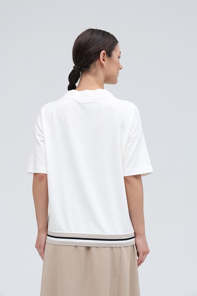 На передней части футболки расположен логотип бренда, выполненный в черном цвете. Дополнительным элементом дизайна является декоративная отделка черной полосой по низу изделия. Футболка изготовлена из высококачественного хлопка (60%), вискозы (35%) и эластана (5%), что обеспечивает мягкость, приятные тактильные ощущения и хорошую посадку по фигуре.