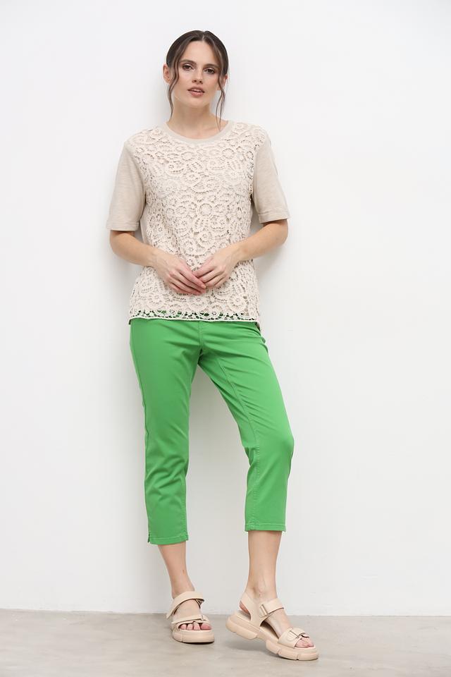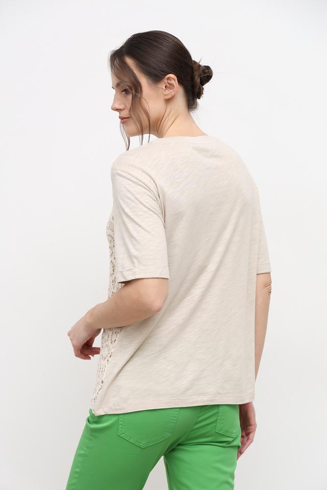 Основная часть футболки выполнена из приятной к телу ткани, состоящей из 50% вискозы и 50% хлопка. Передняя часть украшена изысканным кружевом бежевого оттенка, которое придает изделию женственность и утонченность.