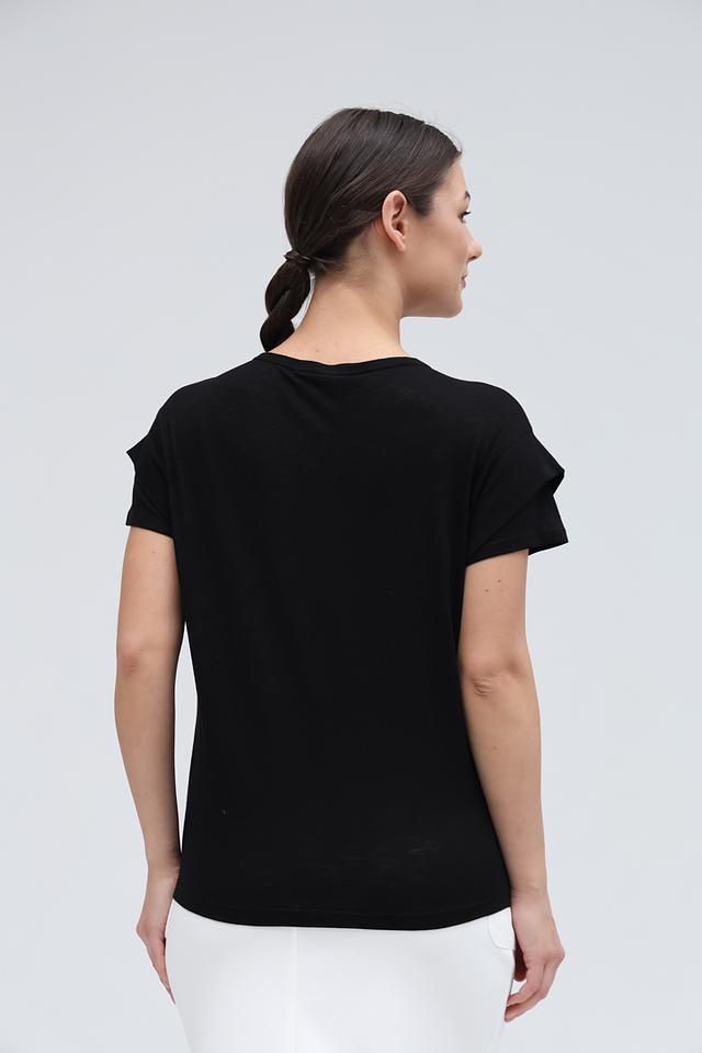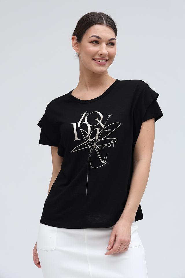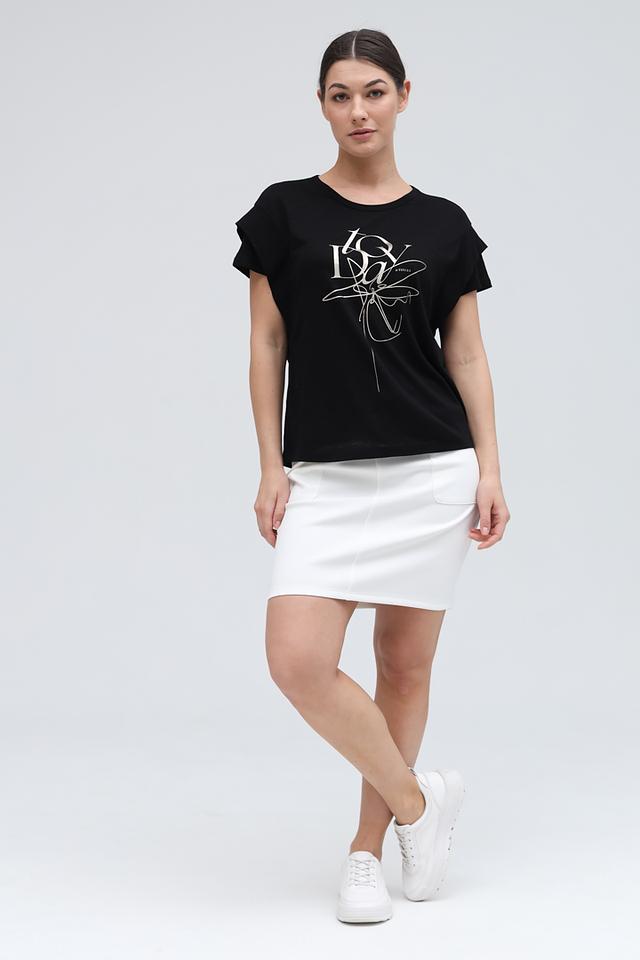 Модель имеет прямой крой и короткие рукава с небольшими складками у плеч, что придает ей особый шарм. Передняя часть футболки украшена стильным белым принтом, добавляющим образу индивидуальность.