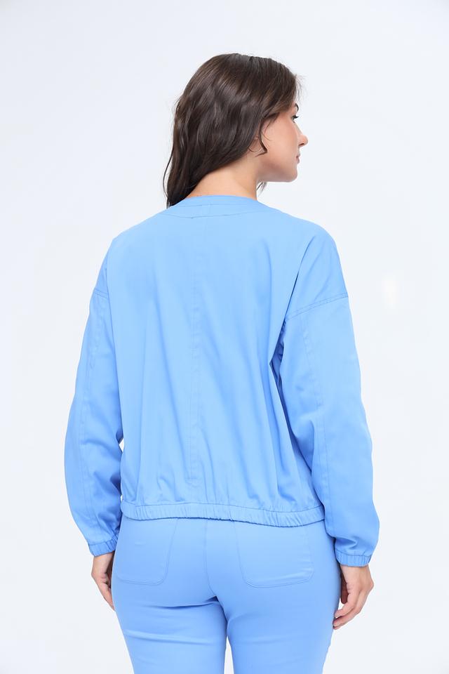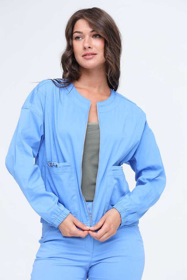 Жакет имеет приталенный силуэт, который подчеркивает фигуру, и застегивается на молнию. Два нагрудных кармана с клапанами добавляют функциональности и стиля. Эластичные манжеты обеспечивают комфортную посадку и предотвращают выбивание рукавов.