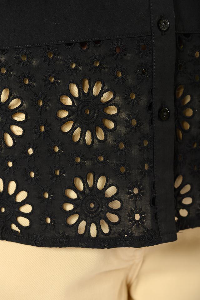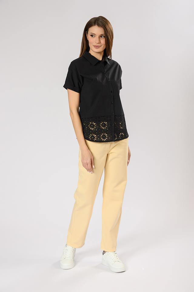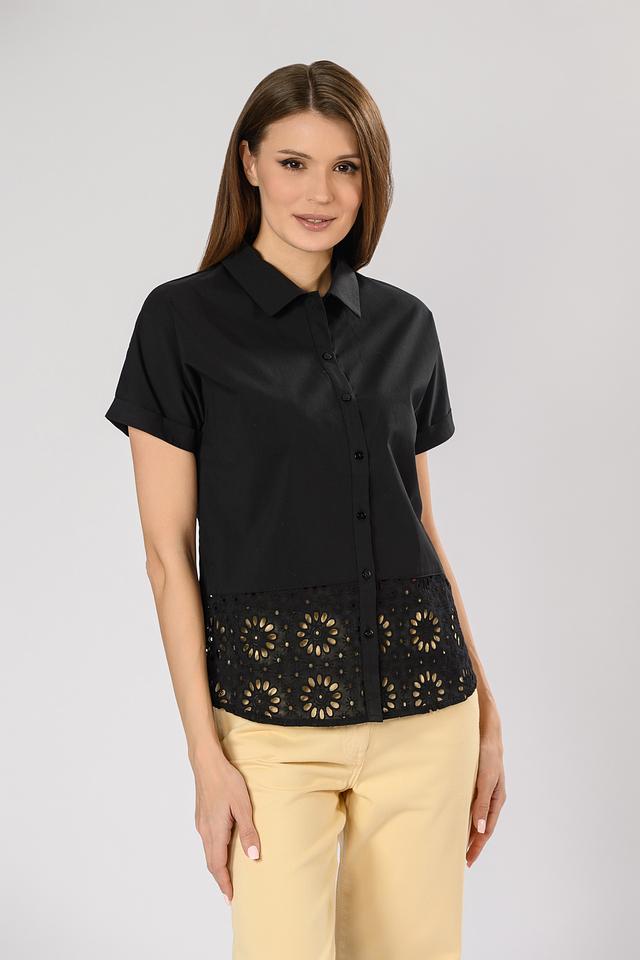 Блуза имеет короткие рукава и классический воротник. Особый акцент сделан на декоративной вышивке в виде цветочного узора, которая придает изделию изысканность и оригинальность. Вышивка расположена на нижней части блузы, создавая интересный контраст с гладкой тканью верха.