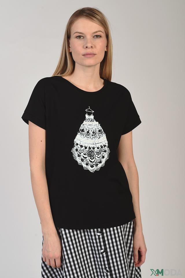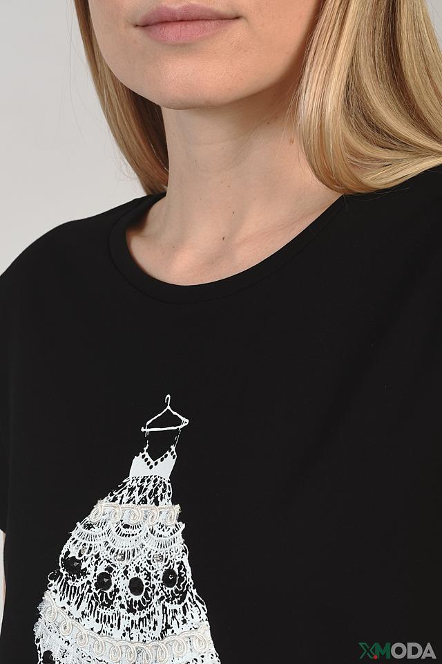 Чёрная футболка Leo & Ugo с оригинальным белым принтом в виде платья на вешалке. Изготовлена из мягкой и приятной к телу вискозы с добавлением нейлона, обеспечивающего износостойкость. Состав: вискоза 61%, нейлон 39%
