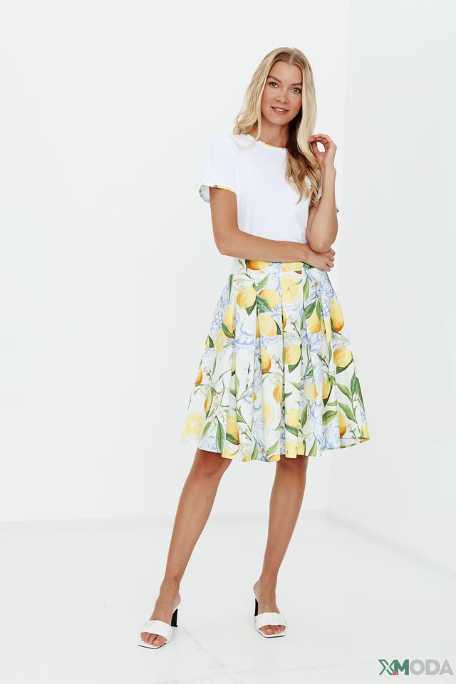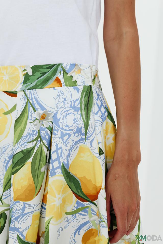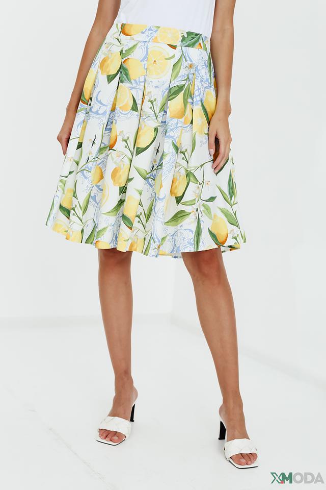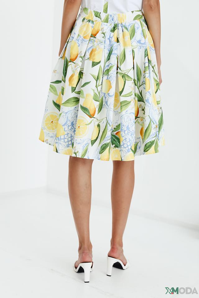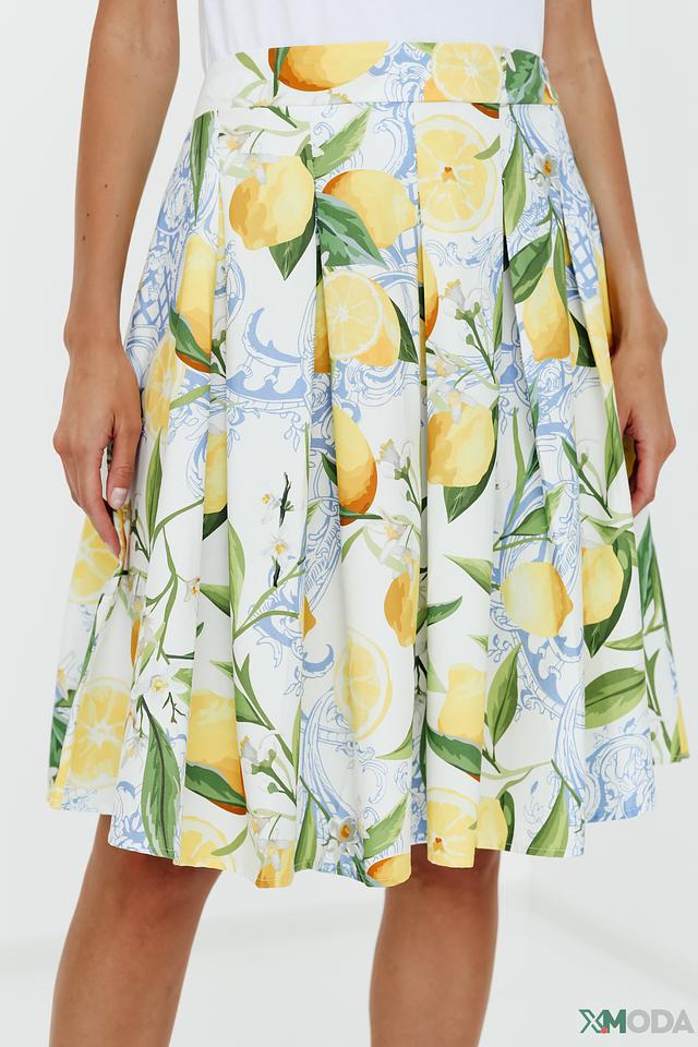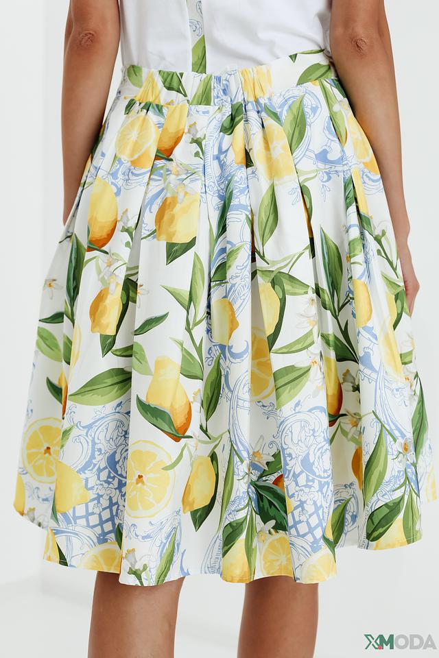 Основной цвет юбки – белый, а ее поверхность украшен красочным принтом с изображением лимонов, листьев и узоров в голубых тонах. Юбка имеет классический крой с плиссировкой, что придает ей объем и легкость.