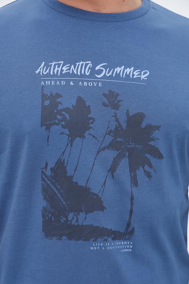 Эта стильная футболка от Lerros станет отличным дополнением к вашему гардеробу. Футболка выполнена в насыщенном синем цвете и украшена ярким принтом с изображением пальм и надписью "Authentic Summer".