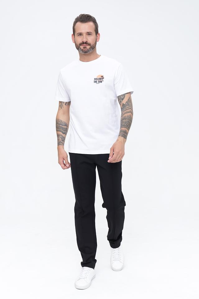 Основным акцентом футболки является яркий принт "Follow the Sun" с изображением пальмы и восходящего солнца, выполненный в оранжево-черной гамме. Принт расположен в центральной части груди и придает футболке индивидуальность.