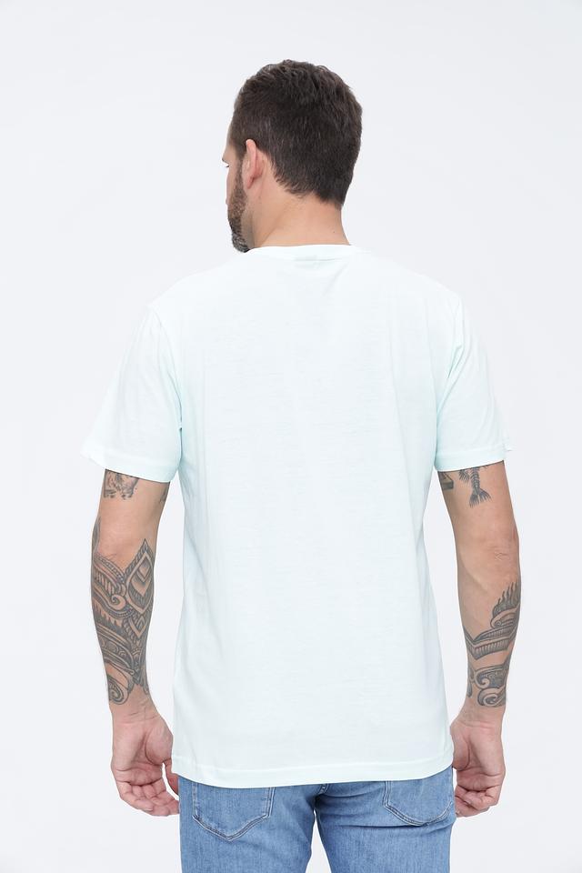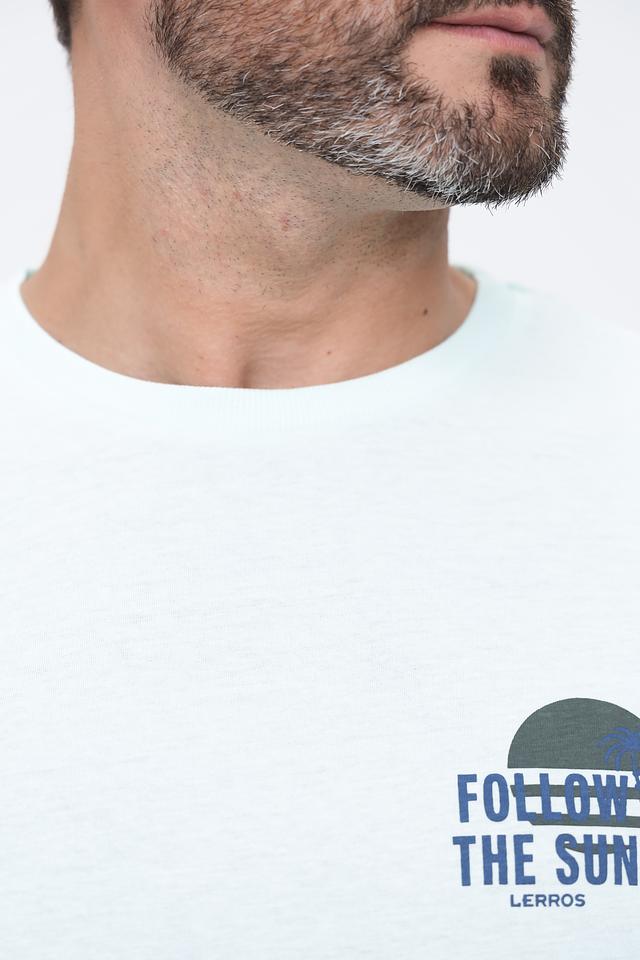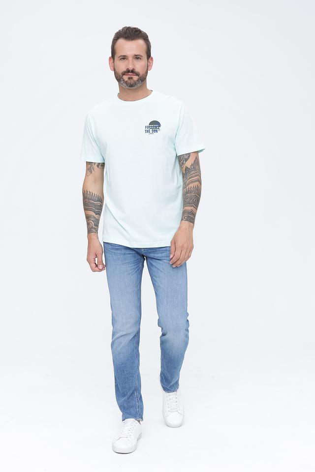 Футболка имеет классический прямой крой, который подходит для любого типа фигуры. Мятный цвет придает образу свежесть и легкость. На передней части футболки расположен оригинальный принт с изображением солнца и надписью "FOLLOW THE SUN".