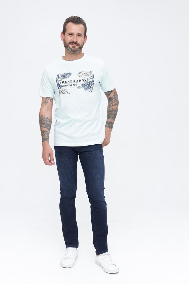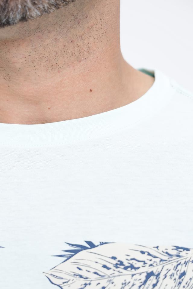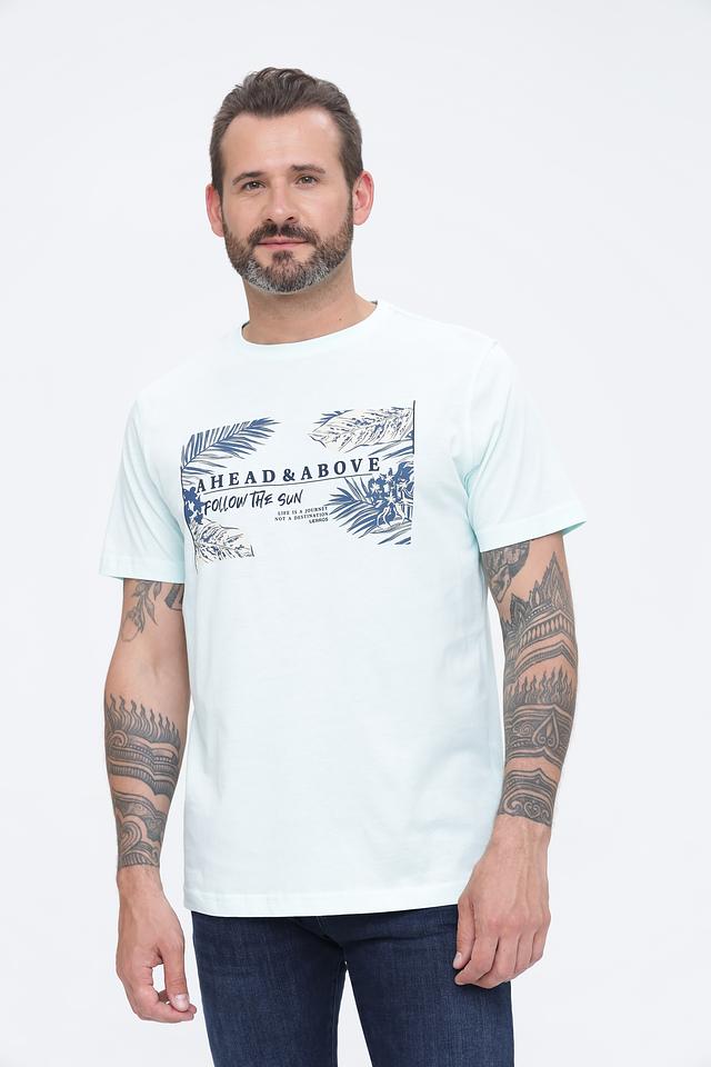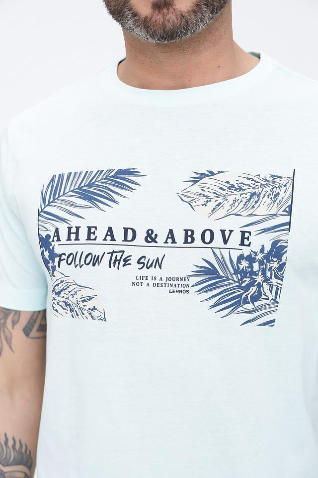 Особенностью данной модели является оригинальный принт "Ahead & Above Follow The Sun" с изображением пальмовых листьев и надписями, выполненный в синих и белых тонах. Принт расположен в верхней части футболки и придает ей стильный и современный вид.