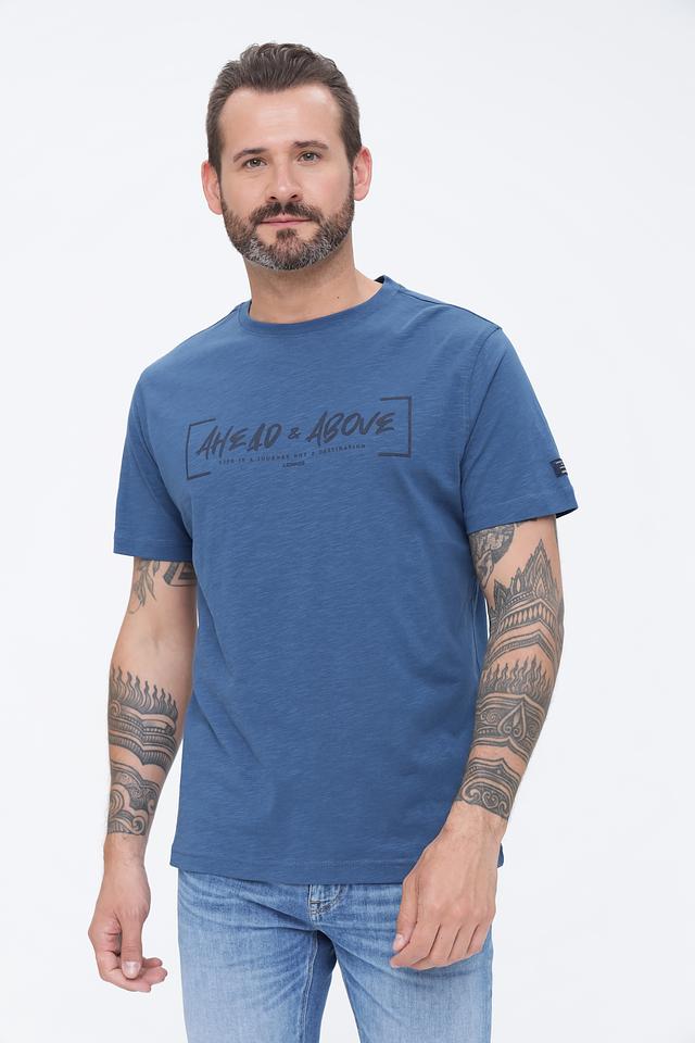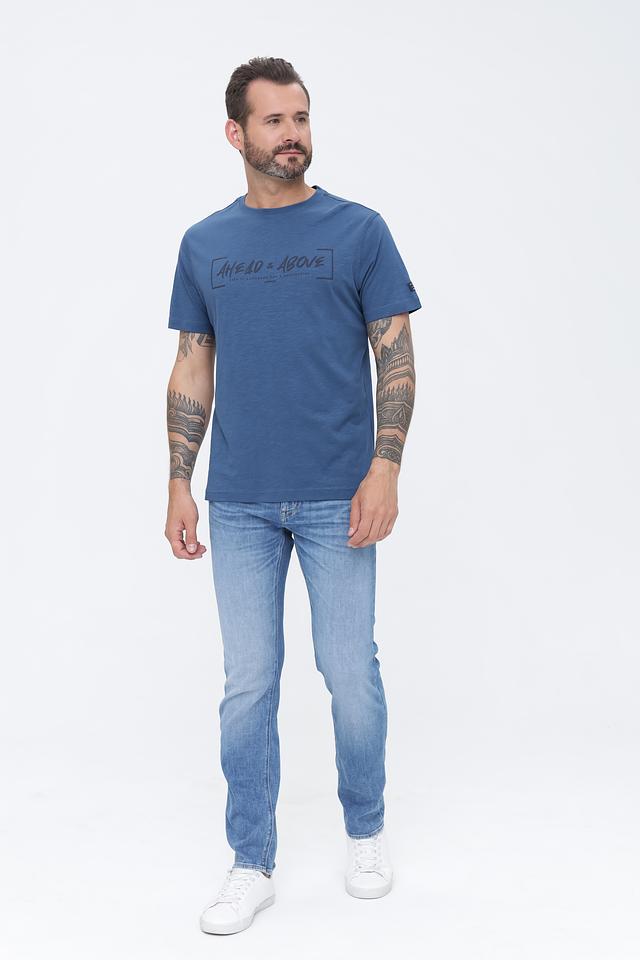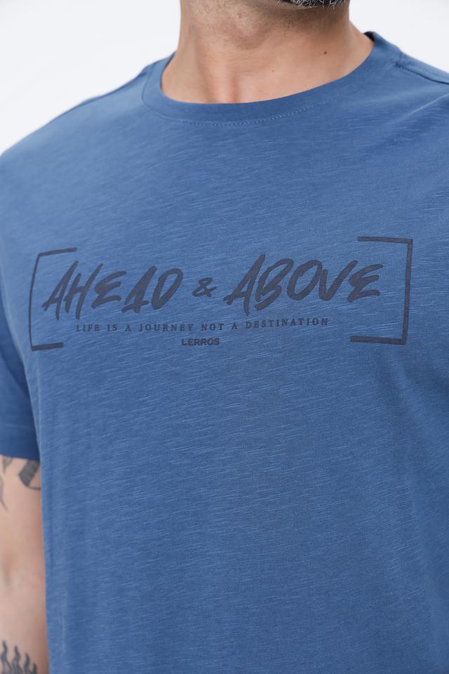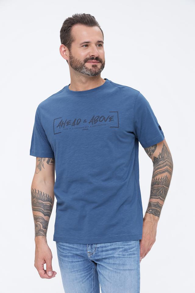 Синяя футболка Lerros с оригинальным принтом "AHEAD & ABOVE" станет отличным дополнением к вашему гардеробу. Изготовлена из 100% хлопка, обеспечивая комфорт и удобство в носке. Состав: хлопок 100%