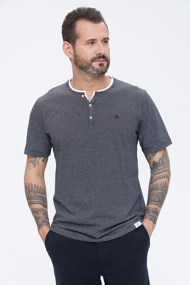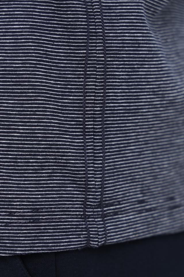 Дизайн модели выполнен в виде тонкой полоски синих и белых оттенков, что придает ей свежий и динамичный вид. V-образный вырез горловины дополнен контрастной белой окантовкой, а застежка на три пуговицы позволяет регулировать степень открытости.