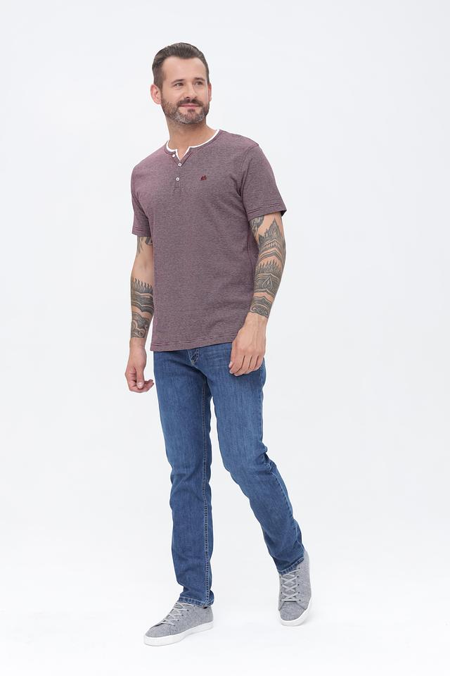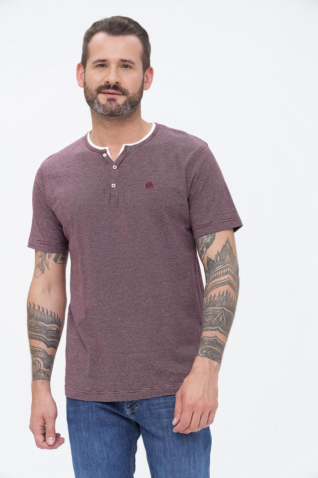 Это мужское поло от Lerros выполнено в бордовом цвете с мелким рисунком в виде полоски. Классический крой и короткие рукава делают его универсальным вариантом для создания различных образов.