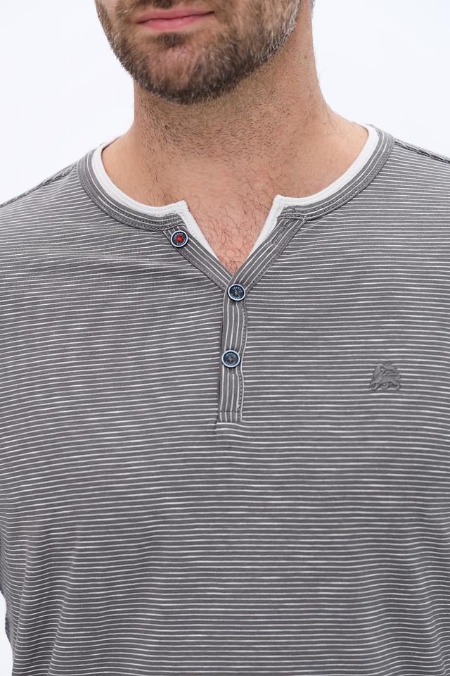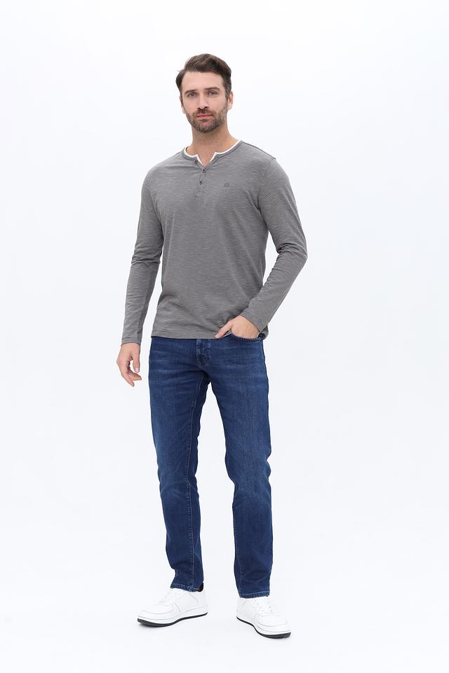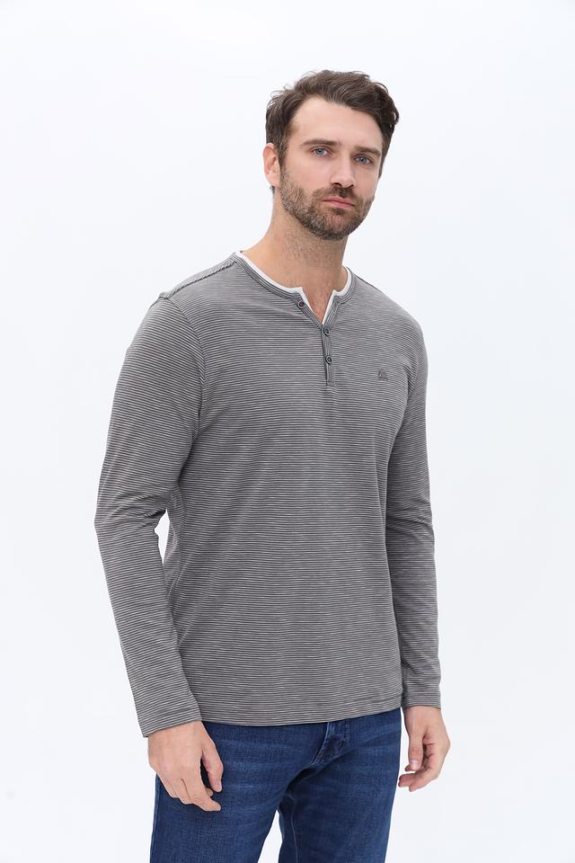 Модель имеет V-образный вырез и застежку на три пуговицы, что добавляет оригинальности. Лонгслив выполнен из 100% хлопка, что обеспечивает комфорт и воздухопроницаемость.
