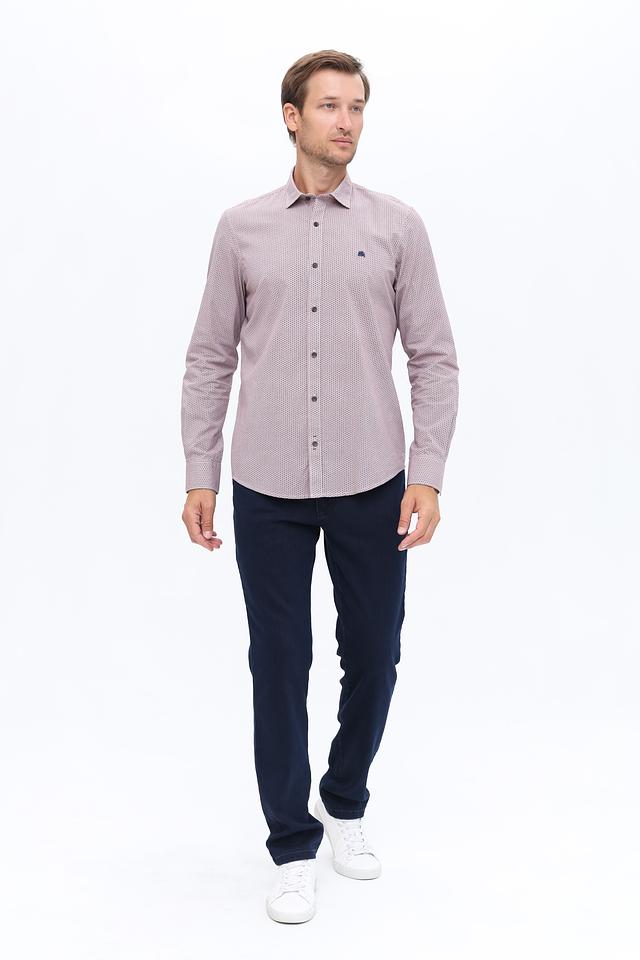 Рубашка имеет светло-лиловый цвет и украшена мелким геометрическим принтом, который придает ей современный и элегантный вид. Классический крой делает ее универсальной для различных случаев – от деловых встреч до повседневной носки.