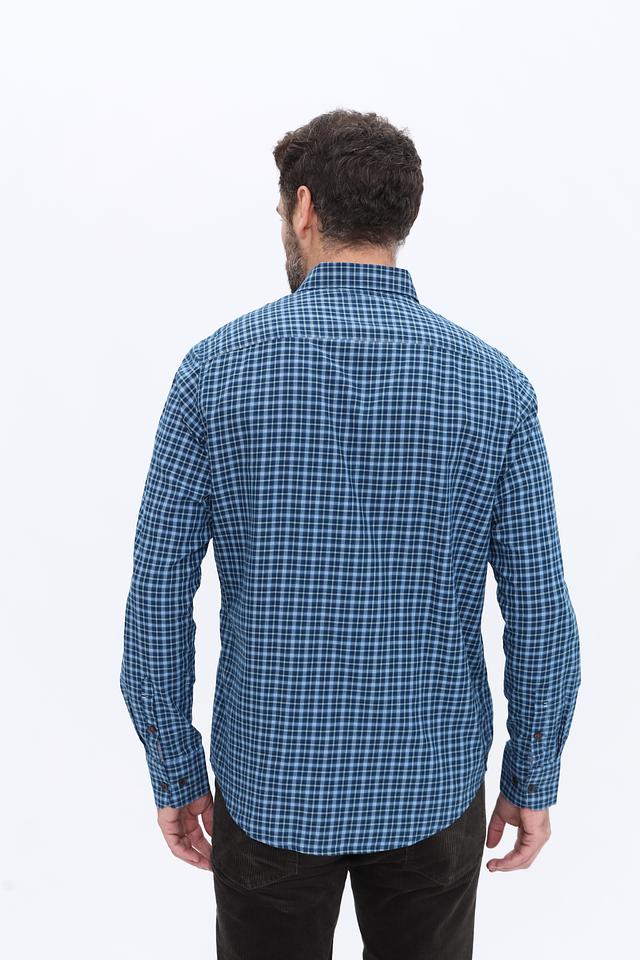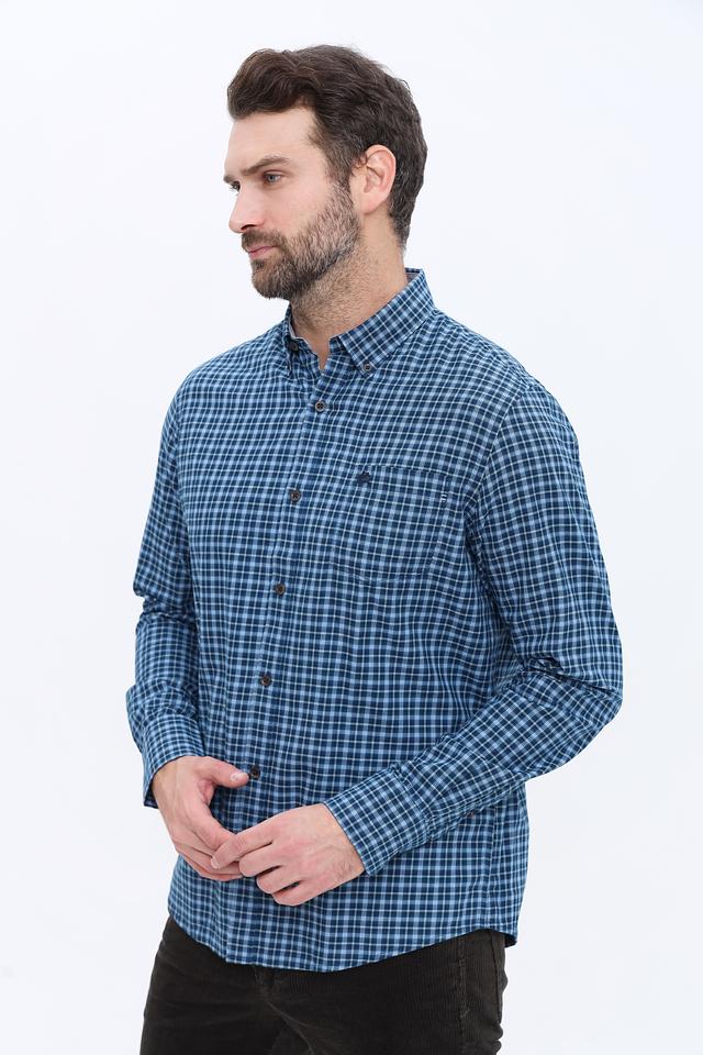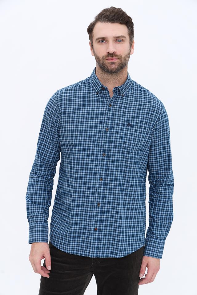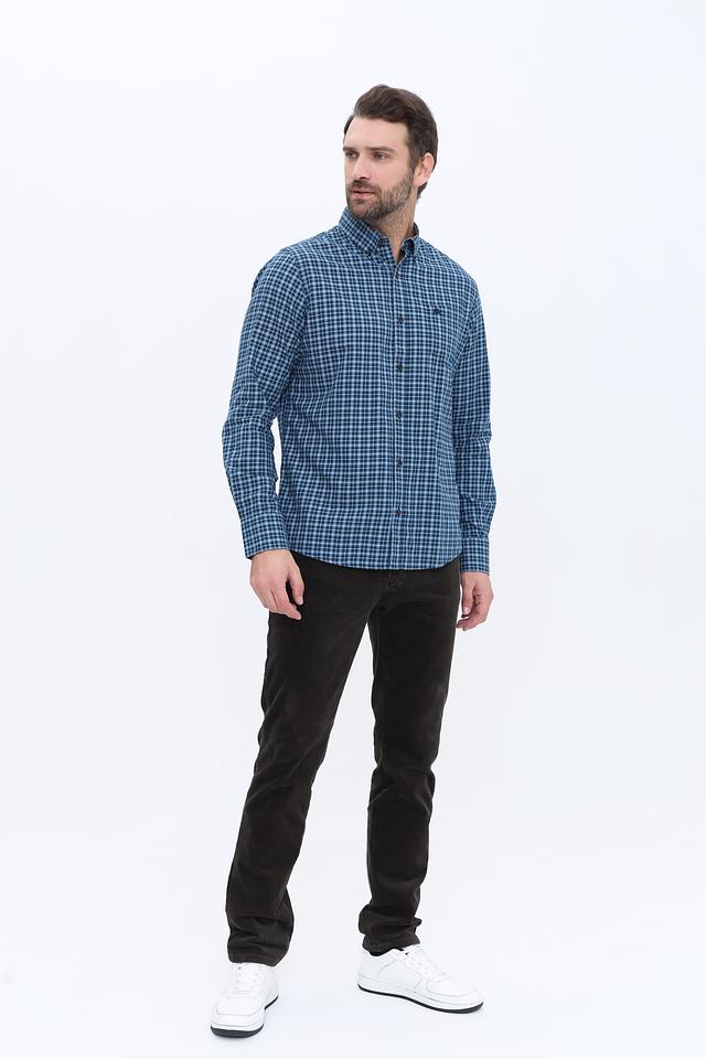 Рубашка имеет классический крой и длинные рукава, что делает ее подходящей для различных случаев. Особенностью данной модели является стильная клетка синих и белых оттенков, которая придает ей современный и привлекательный вид.