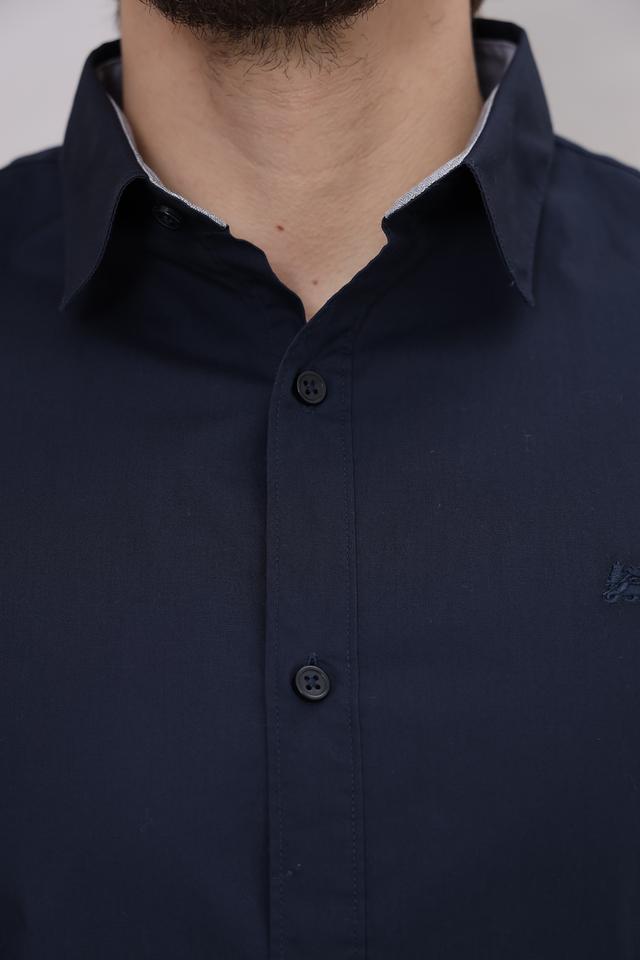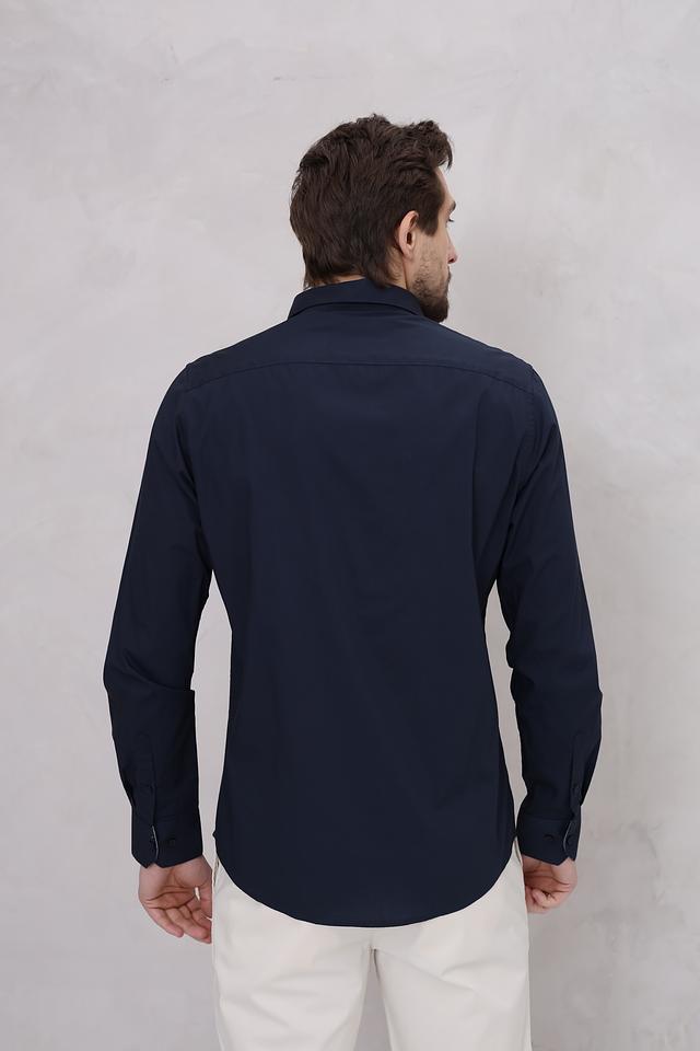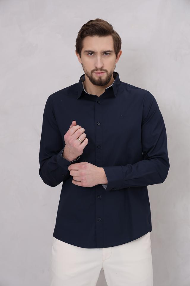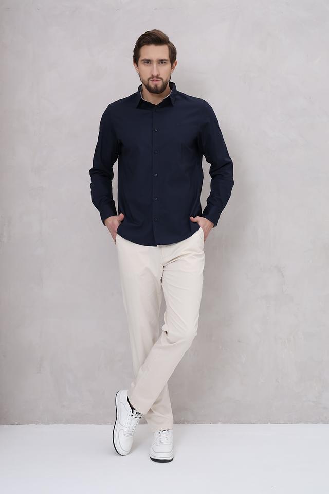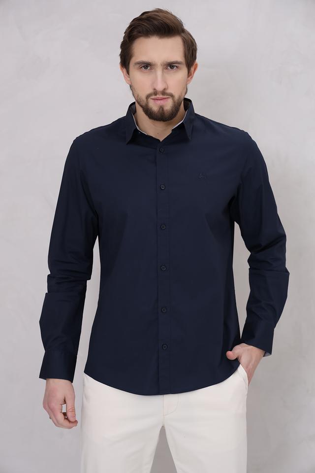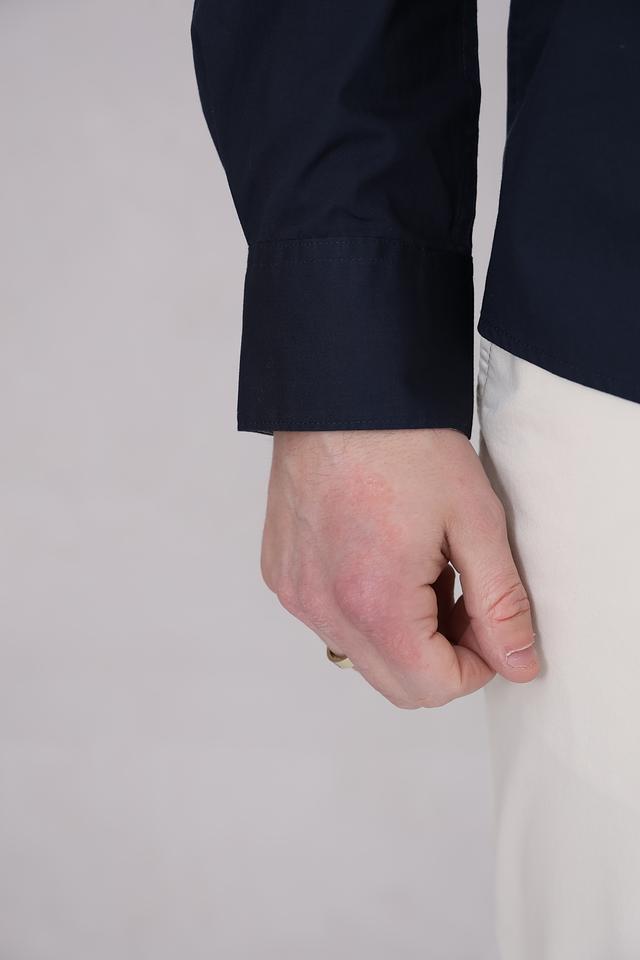Рубашка имеет прямой крой, длинные рукава и традиционный воротник. Она выполнена из 100% хлопка, что обеспечивает комфорт и воздухопроницаемость. Тёмно-синий цвет делает эту рубашку универсальной и легко сочетаемой с различными элементами гардероба.