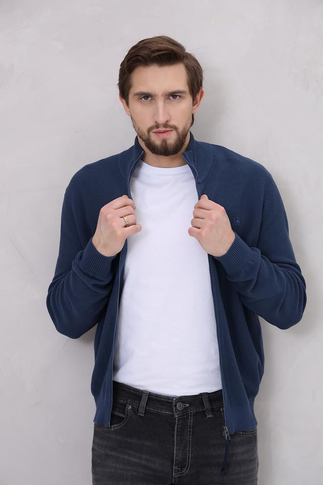 Цвет кардигана – насыщенный синий, который легко сочетается с различными элементами гардероба. На груди расположен небольшой логотип бренда.