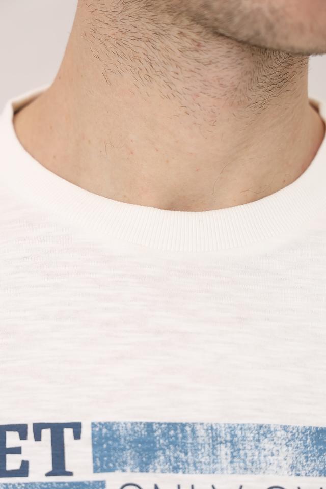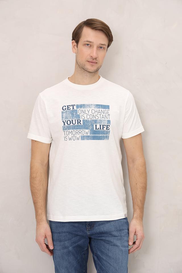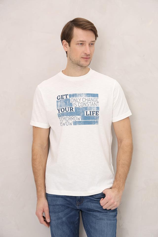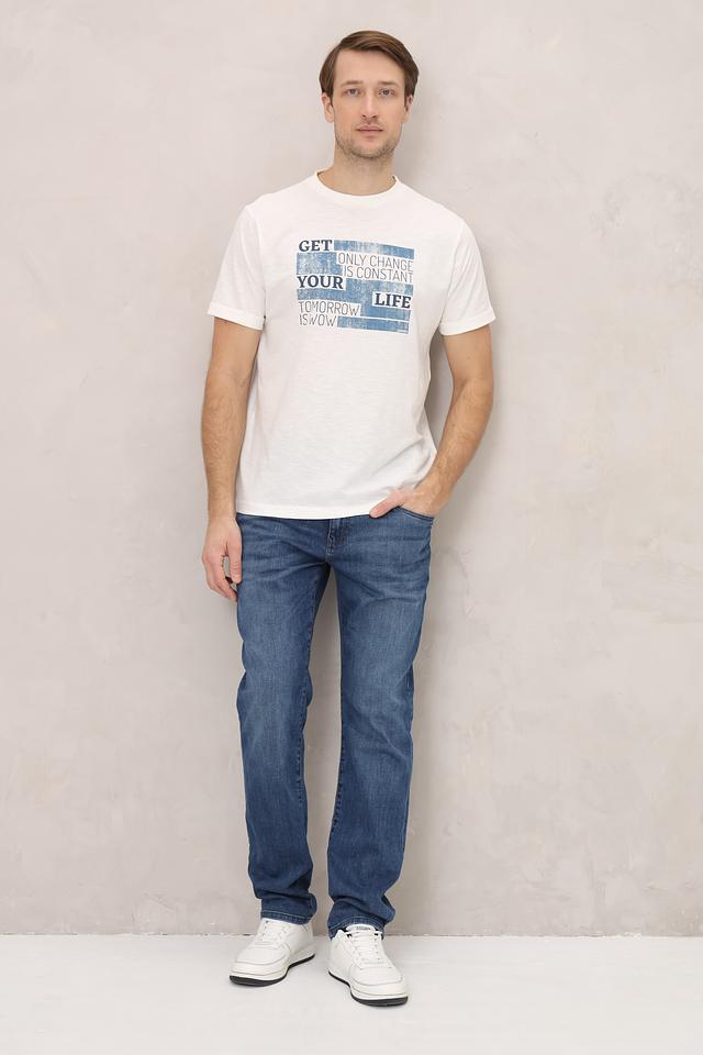 Особенностью данной модели является стильный принт с надписями в синих тонах, который придаёт ей современный и динамичный вид. Футболка имеет классический прямой крой, который подходит для любого типа фигуры.