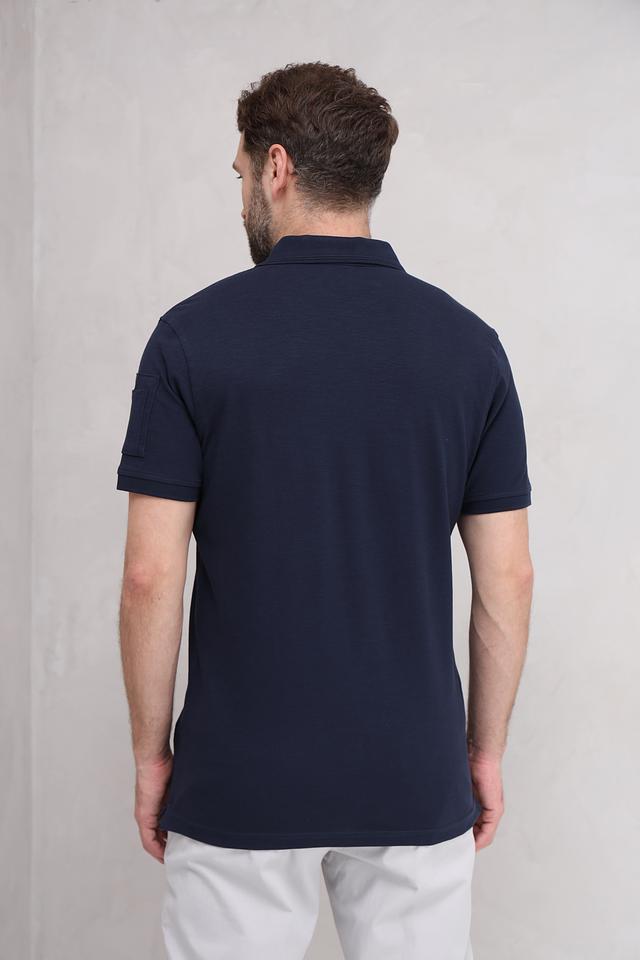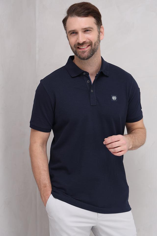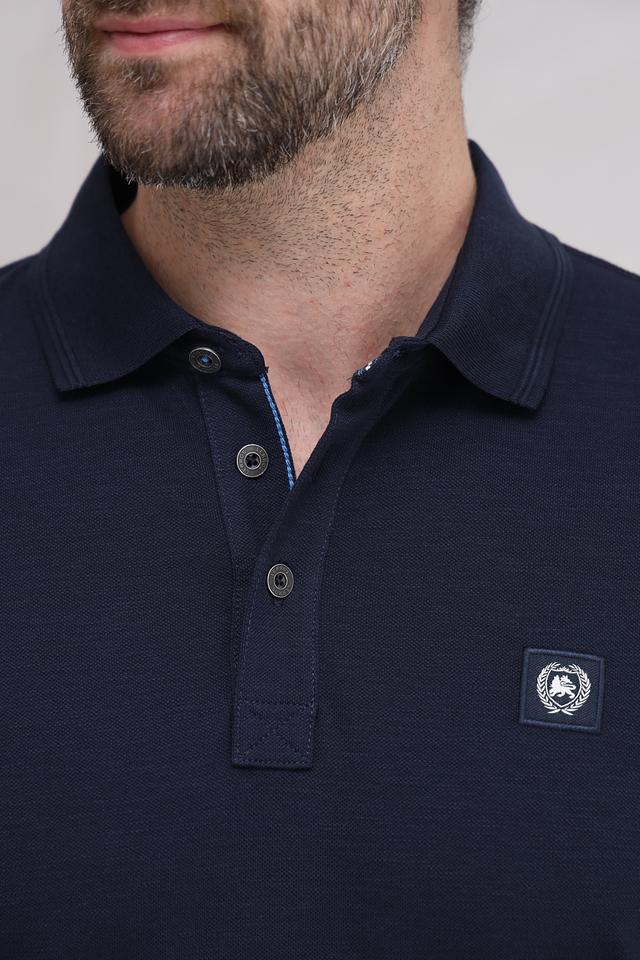 Поло имеет классический крой, короткие рукава и воротник-поло с тремя пуговицами. На груди слева расположен небольшой логотип бренда. Тёмно-синий цвет делает эту модель универсальной и легко сочетаемой с различными элементами гардероба.