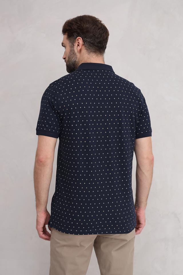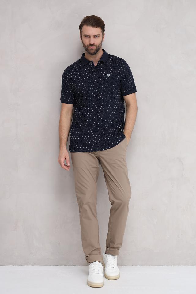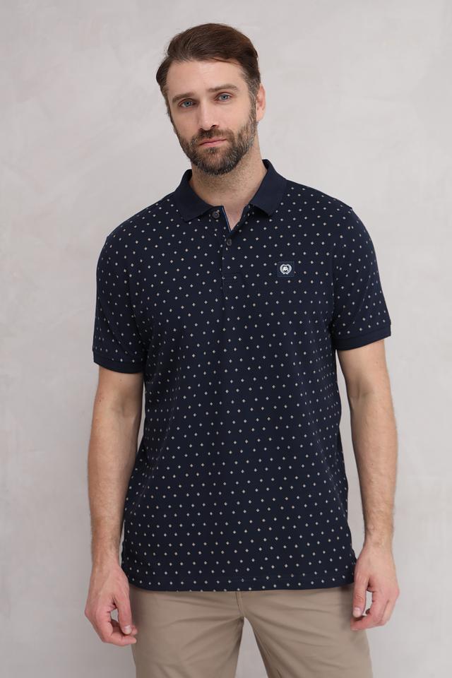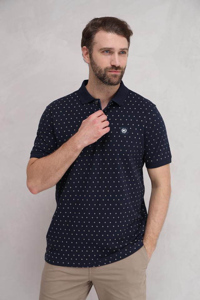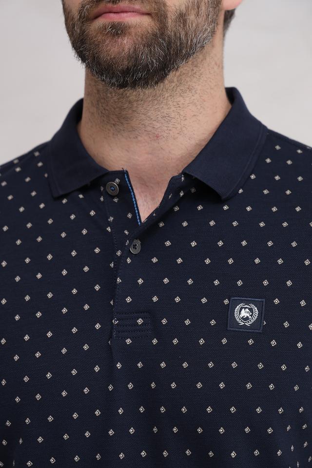 Представляем мужское поло от бренда Lerros. Эта модель выполнена в темно-синем цвете и украшена мелким белым горошком, что придает ей особый шарм и универсальность.