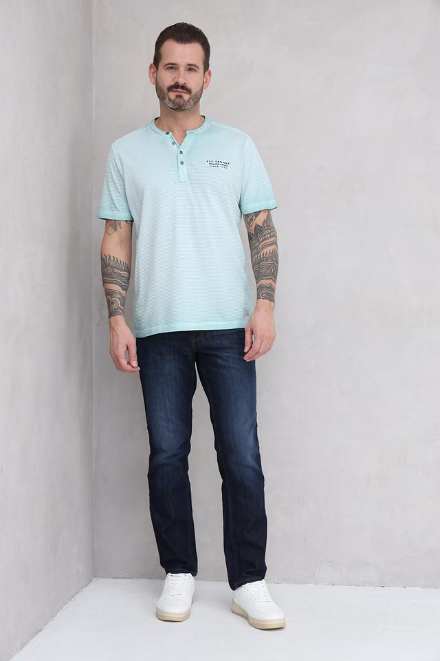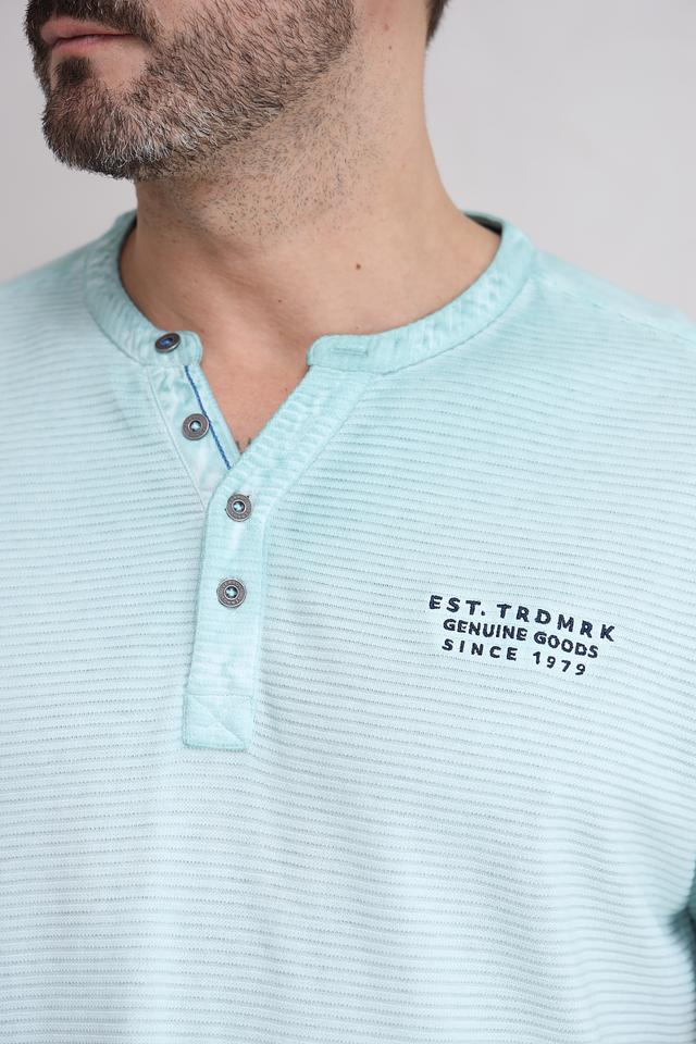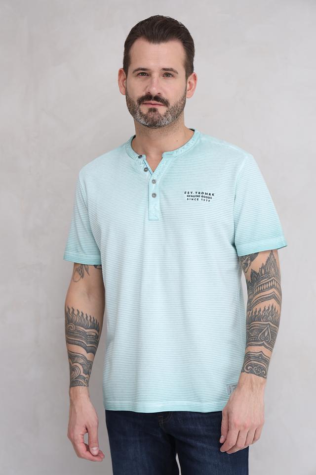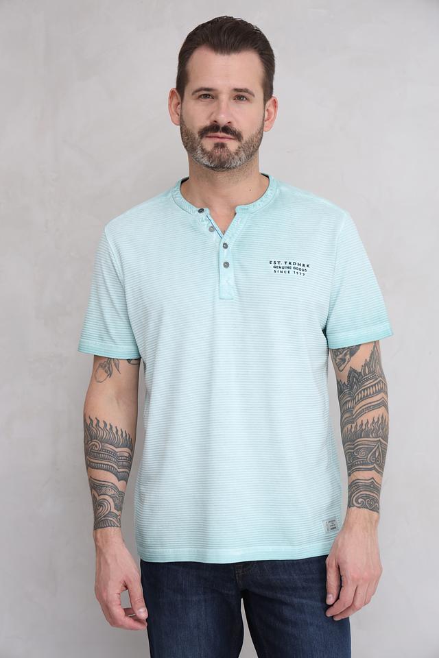 Мятная футболка-поло Lerros из 100% хлопка – это стильное и комфортное решение для повседневного образа. Модель выполнена с коротким рукавом и имеет воротник с планкой на пуговицах, а также деликатную текстуру в полоску. Состав: хлопок 100%