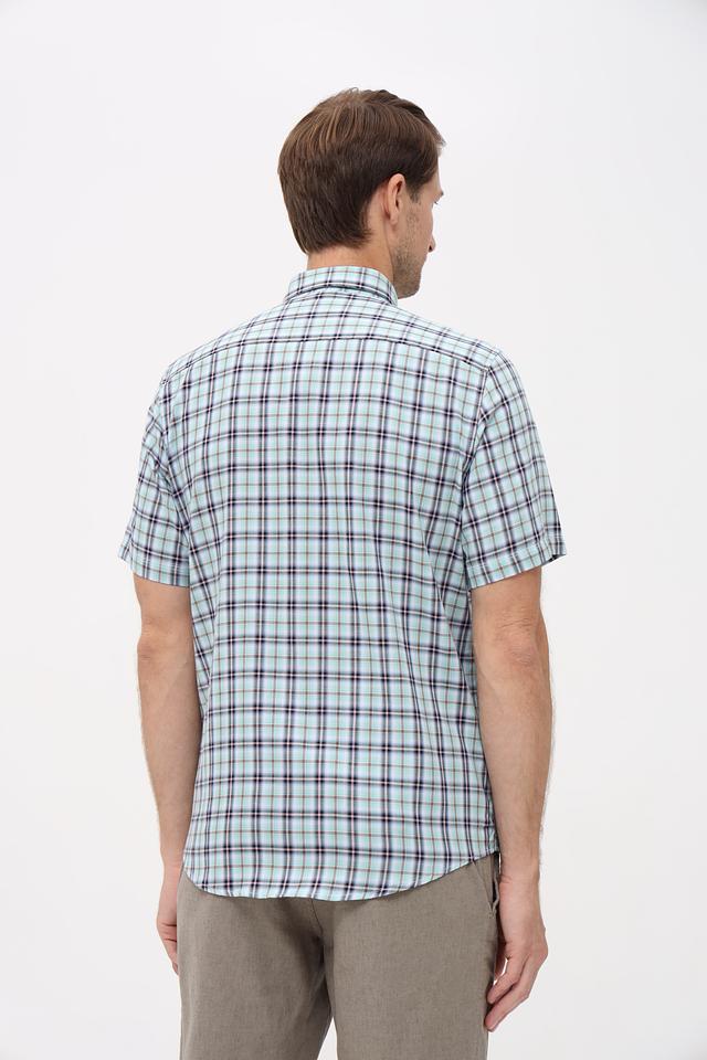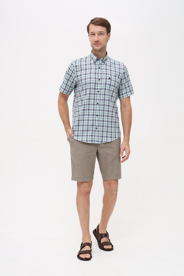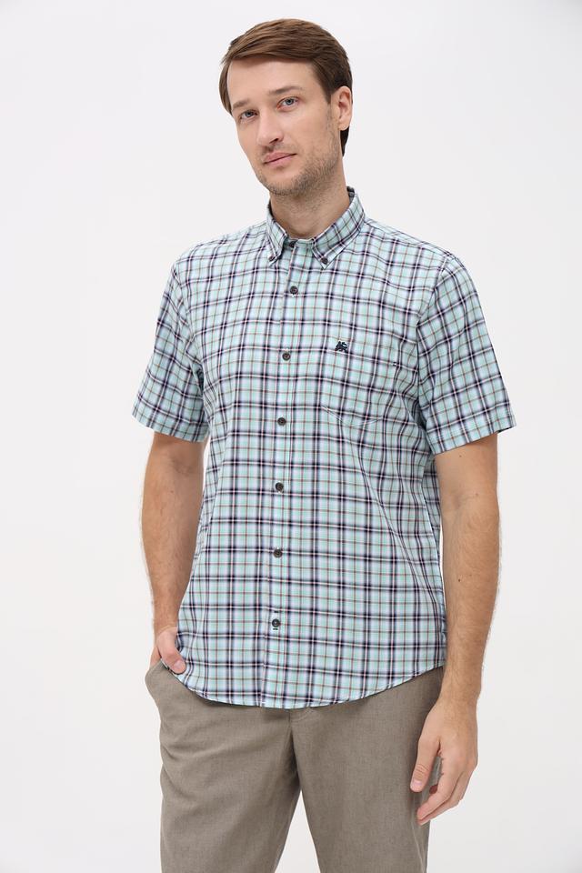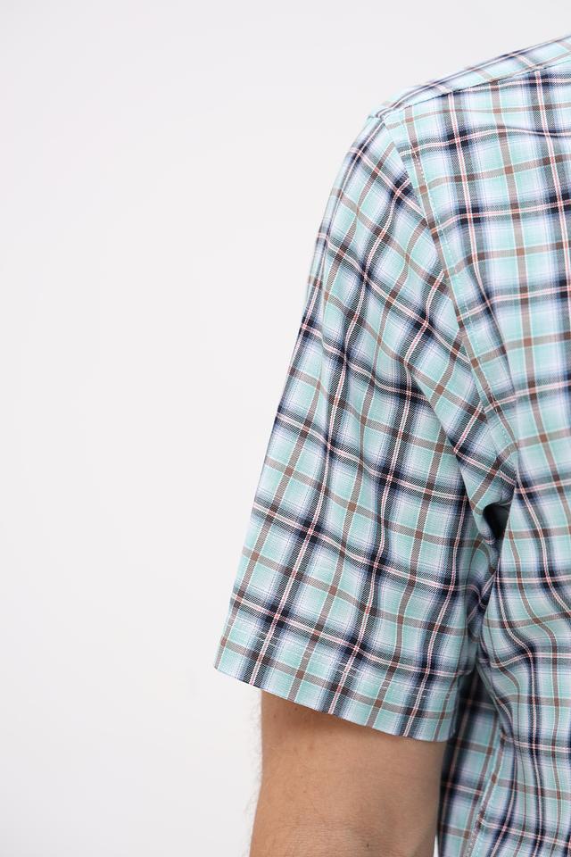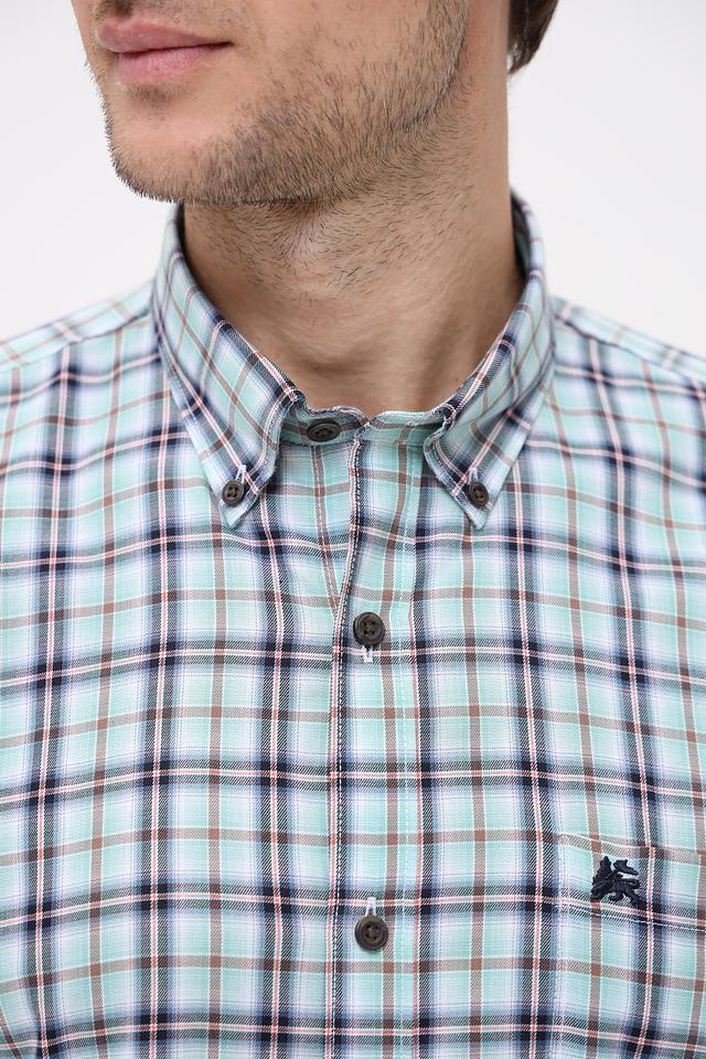 Представляем стильную мужскую рубашку от бренда Lerros. Эта рубашка с коротким рукавом выполнена в светло-зелёном цвете и украшена классическим клетчатым принтом, сочетающим в себе оттенки зелёного, чёрного и белого.