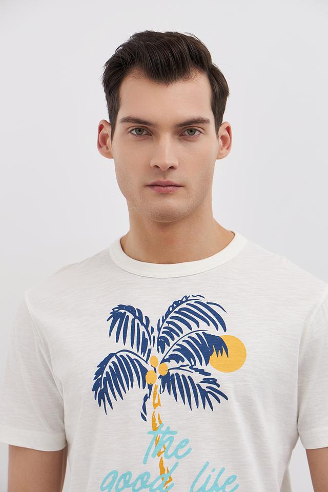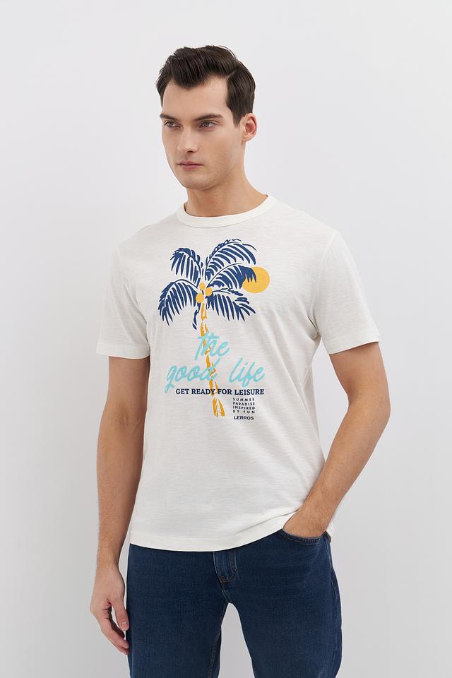Мужская футболка Lerros – это стильное и удобное решение для повседневного гардероба. Футболка выполнена в белом цвете и украшена эффектным принтом с изображением пальм и солнца, что придает ей летнее настроение.