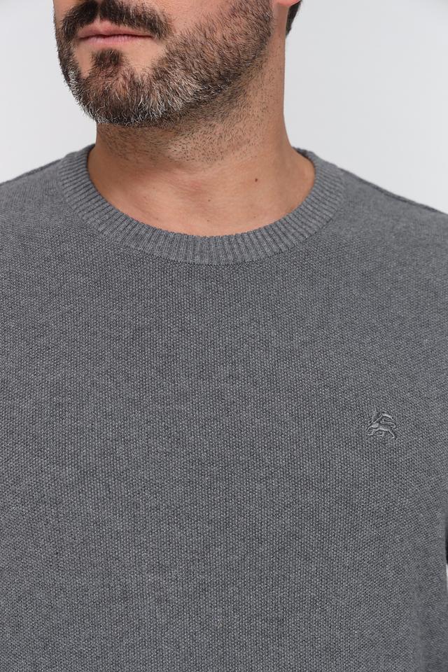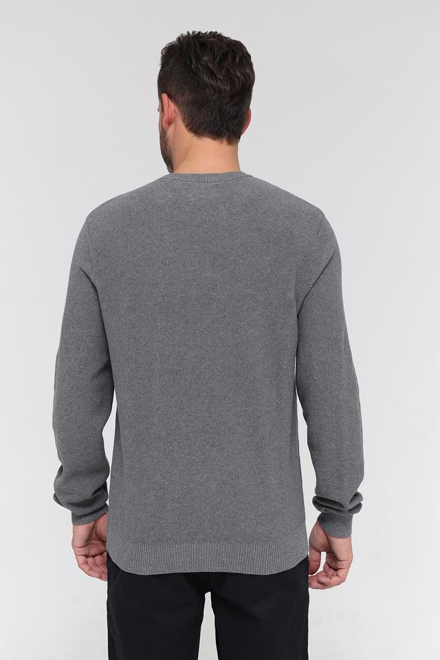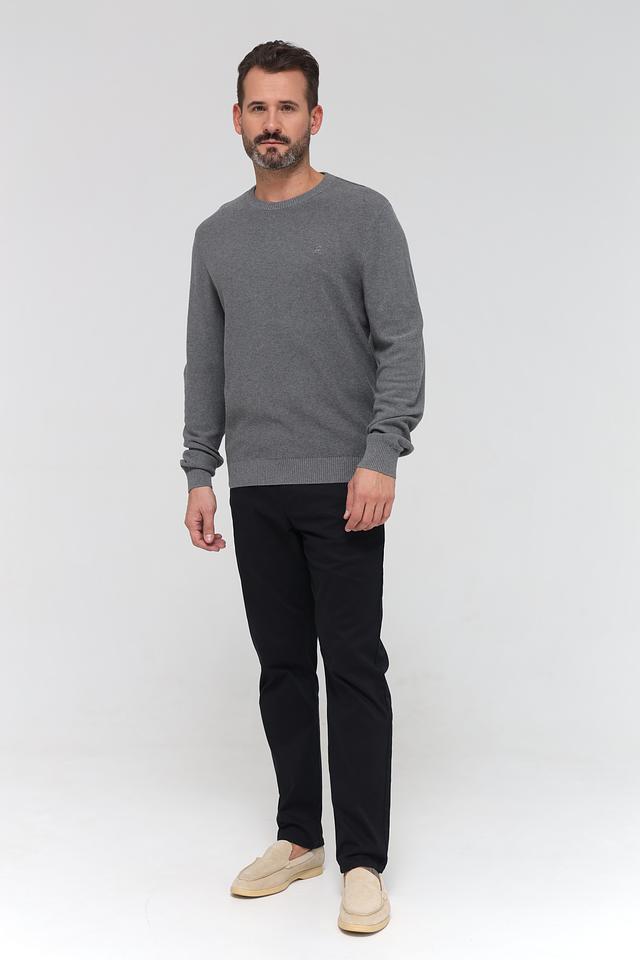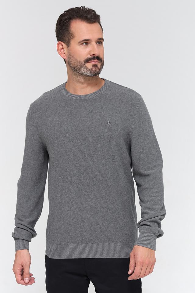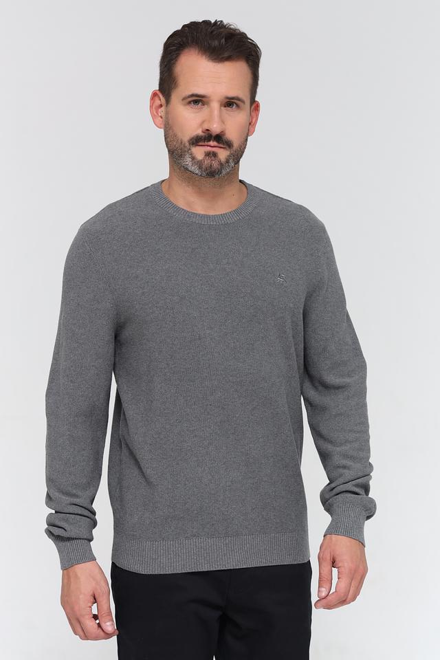 Модель имеет классический круглый вырез горловины и длинные рукава с манжетами. На груди расположен небольшой логотип бренда, добавляющий изделию узнаваемость. Джемпер имеет прямую посадку, не сковывающую движений.