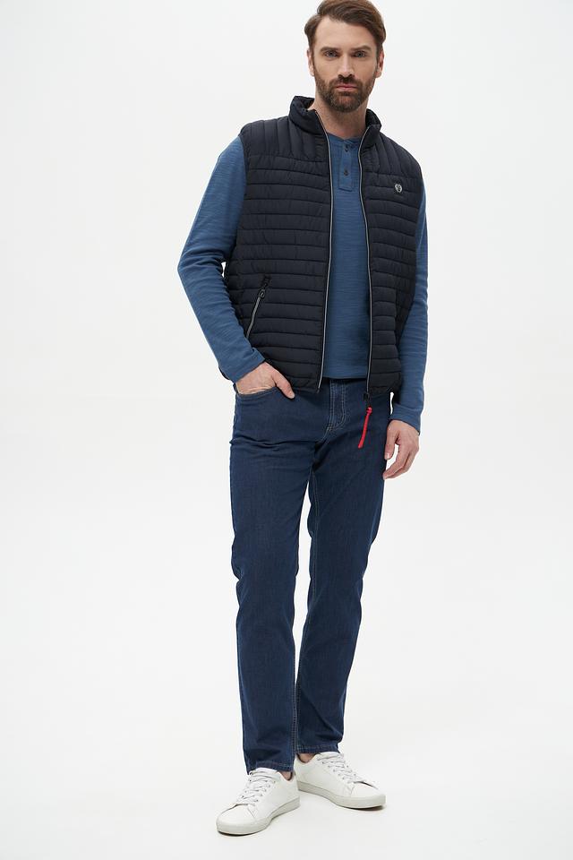 Модель имеет стеганую фактуру, которая придает ей стильный и современный вид. Застежка – молния с красными элементами, добавляющая акцент. Воротник – стойка. Жилет имеет два боковых кармана на молнии.