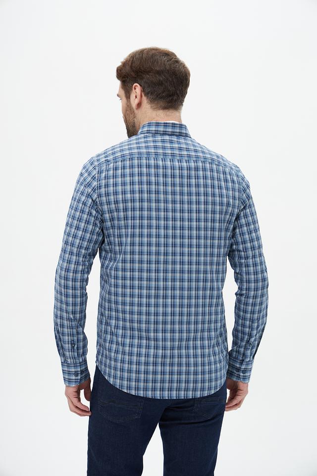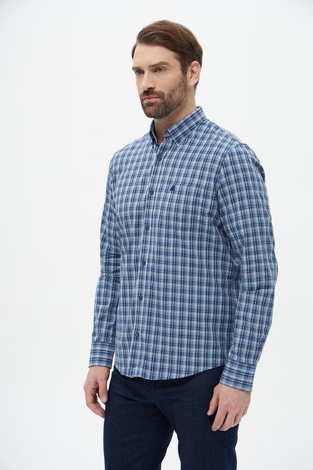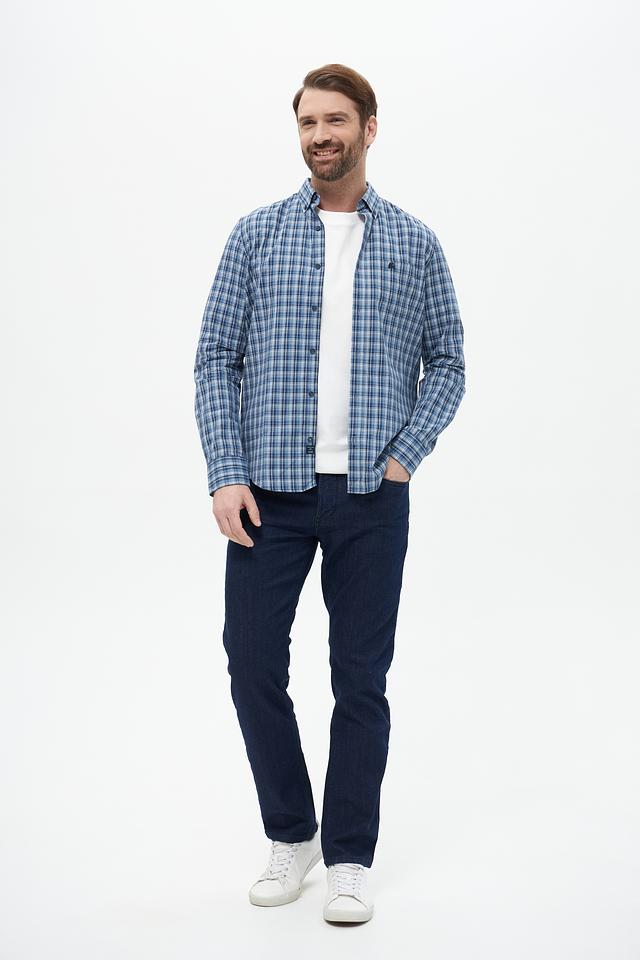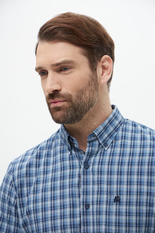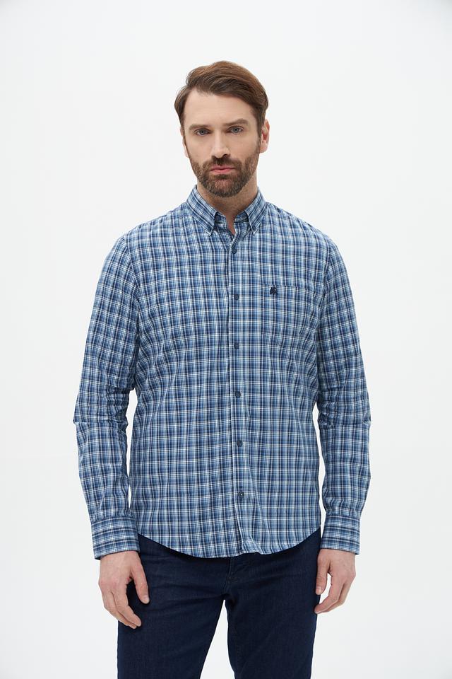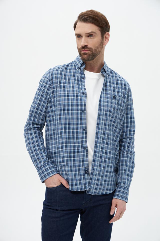 Рубашка выполнена в классическом крое с длинными рукавами и традиционным воротником. Особенностью модели является клетчатый рисунок в синих и белых тонах, который придает ей элегантный и универсальный вид.