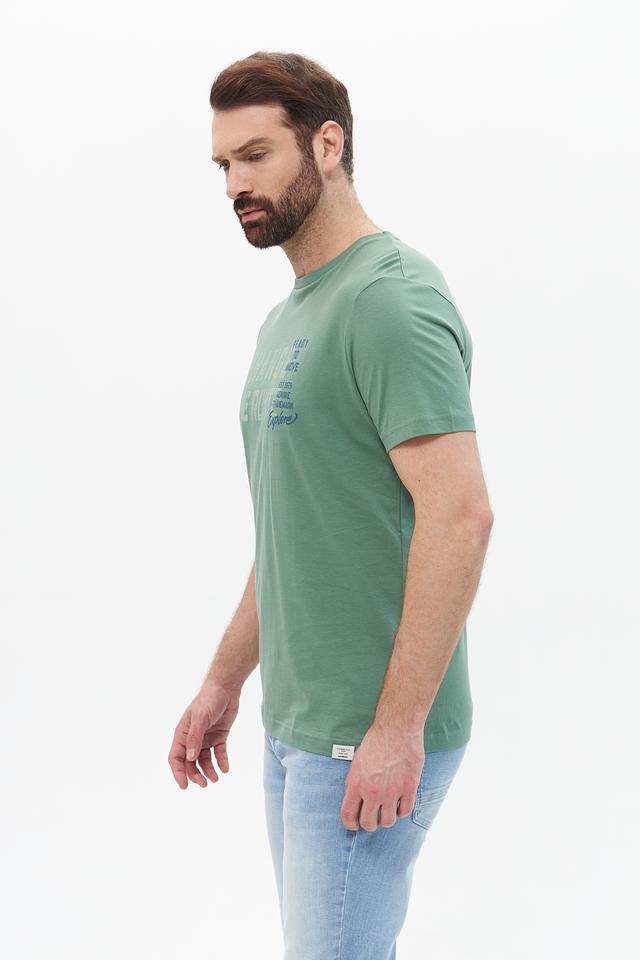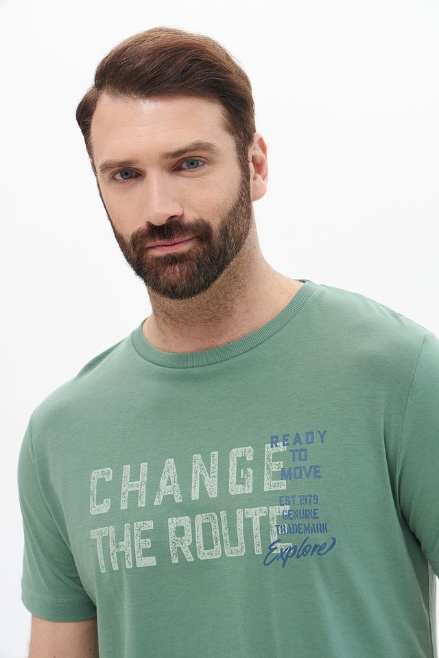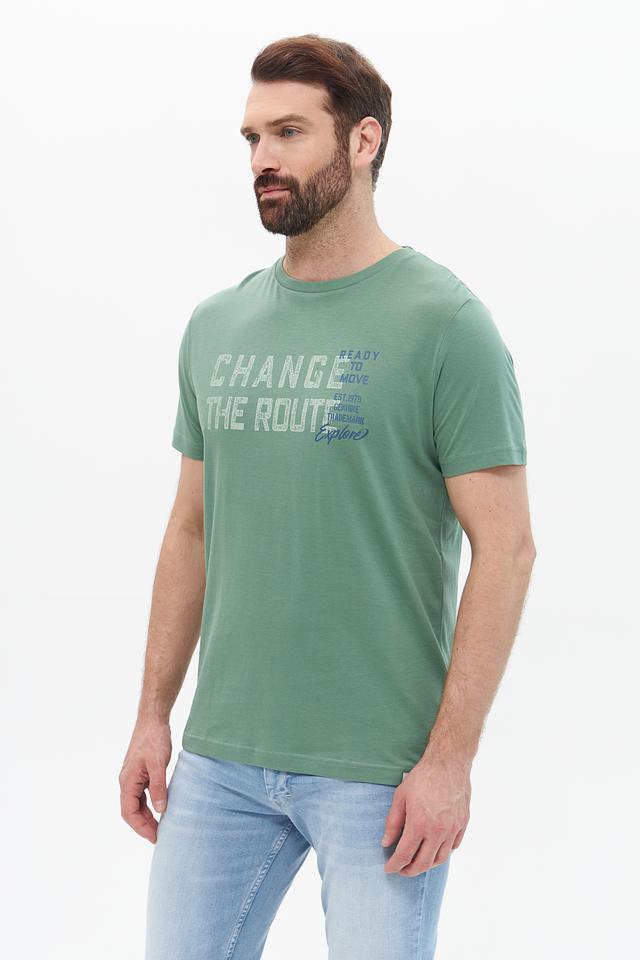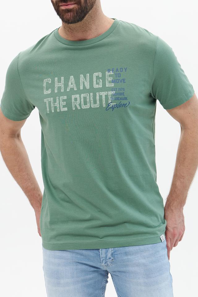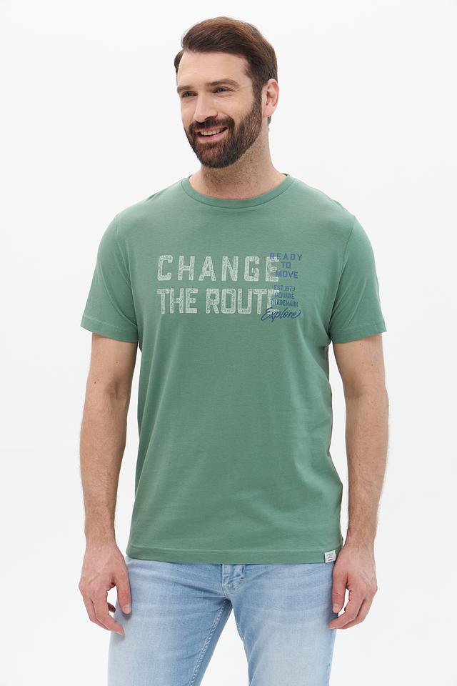 Представляем стильную мужскую футболку от бренда Lerros. Эта футболка выполнена в приятном хаки цвете и украшена эффектным принтом с надписью "CHANGE THE ROUTE" и дополнительными элементами.