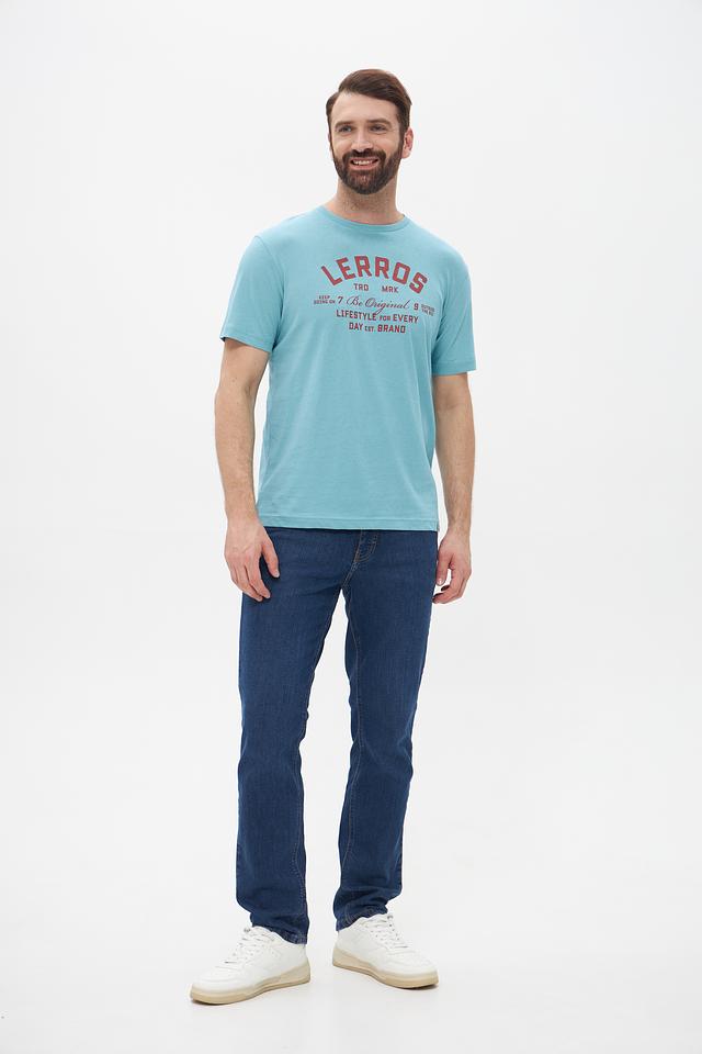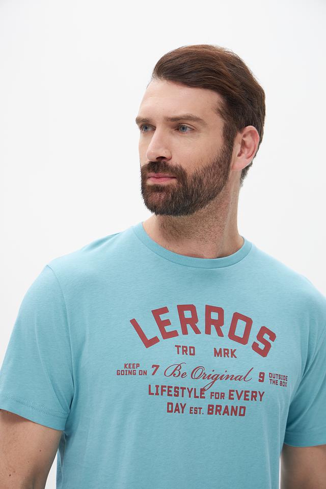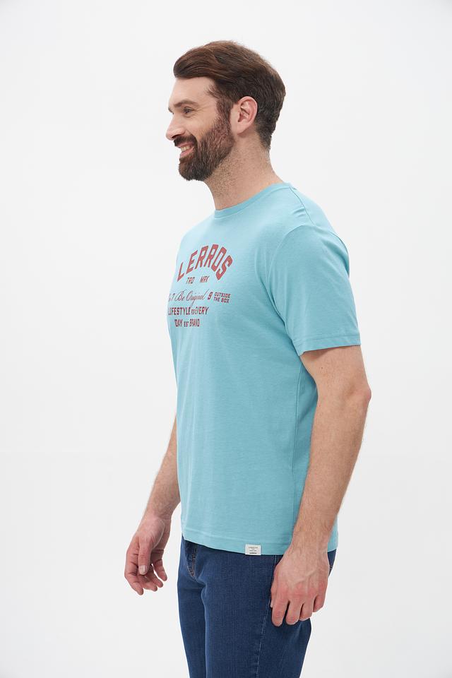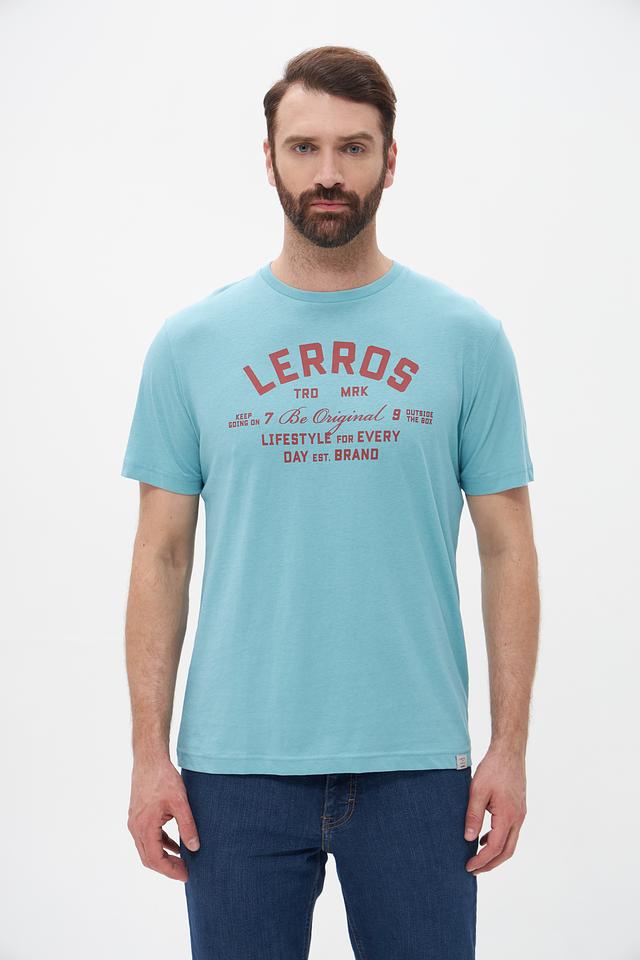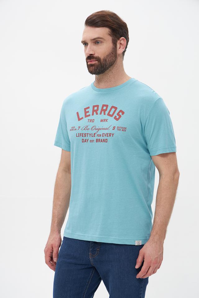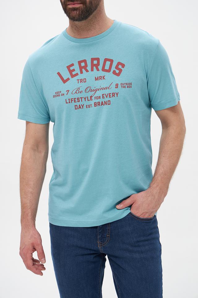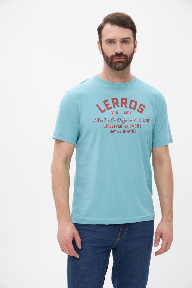 Мужская футболка Lerros бирюзового цвета с принтом логотипа бренда. Изготовлена из хлопка с добавлением эластана для комфорта и лучшей посадки. Состав: хлопок 98%, эластан 2%