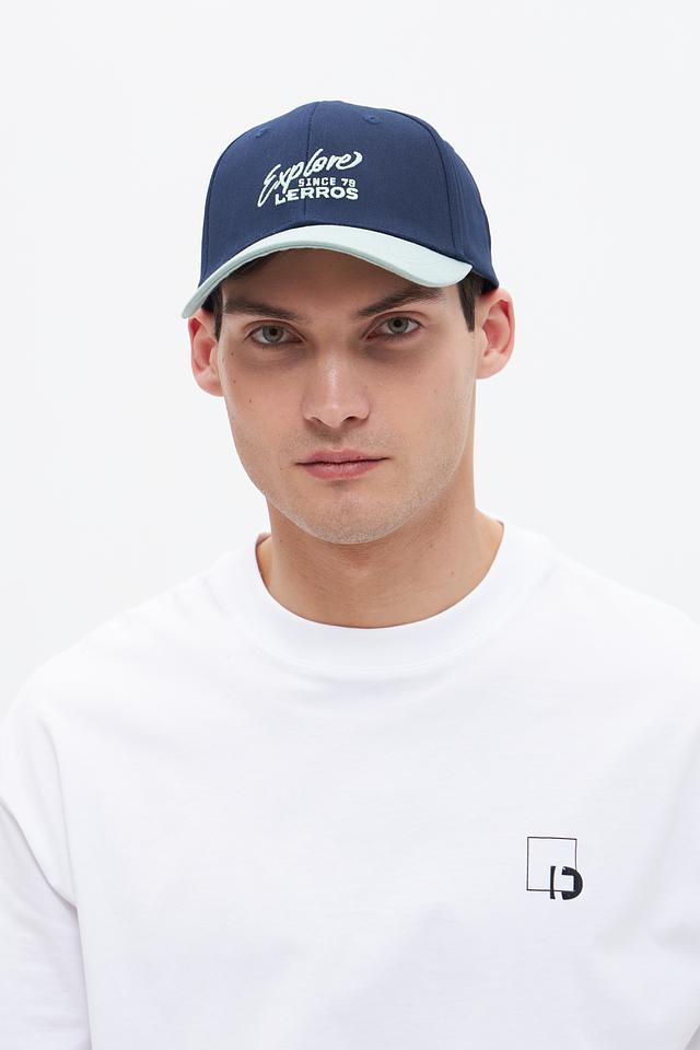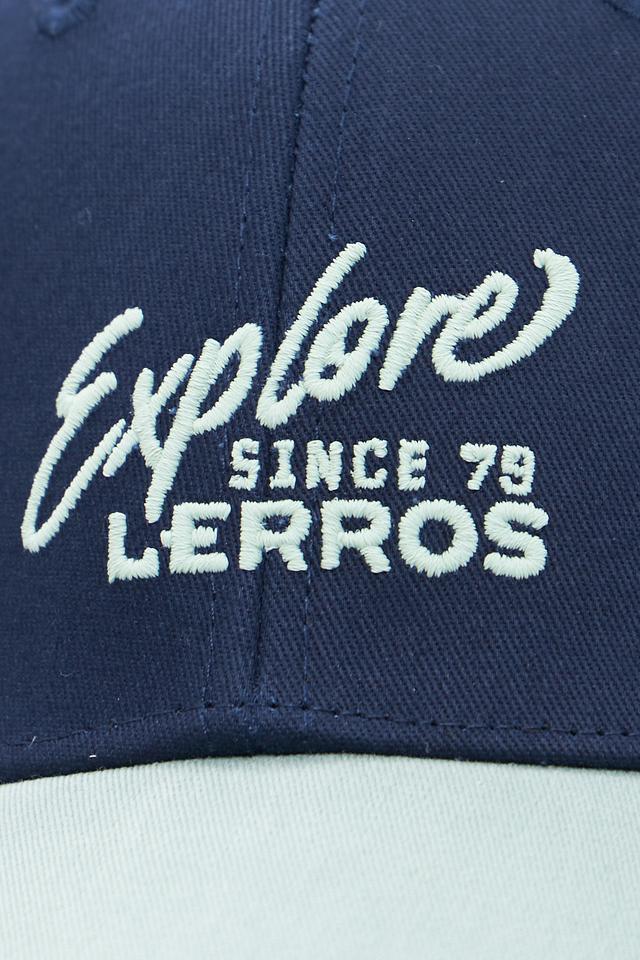 На передней панели кепки выполнена вышивка с логотипом бренда "Explore Since 79 Lerros", выполненная белыми нитками. Бейсболка имеет регулируемый ремешок с пластиковой застежкой для оптимальной посадки по размеру.