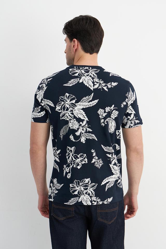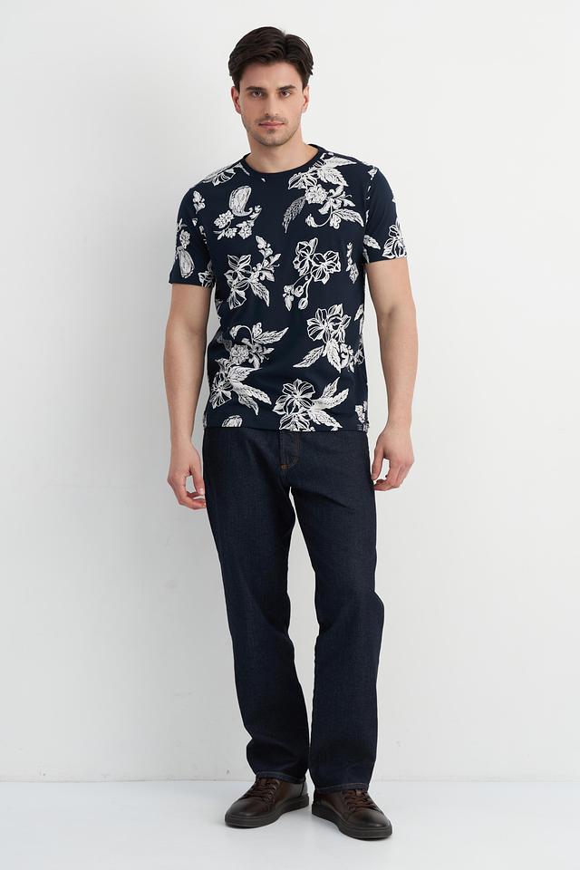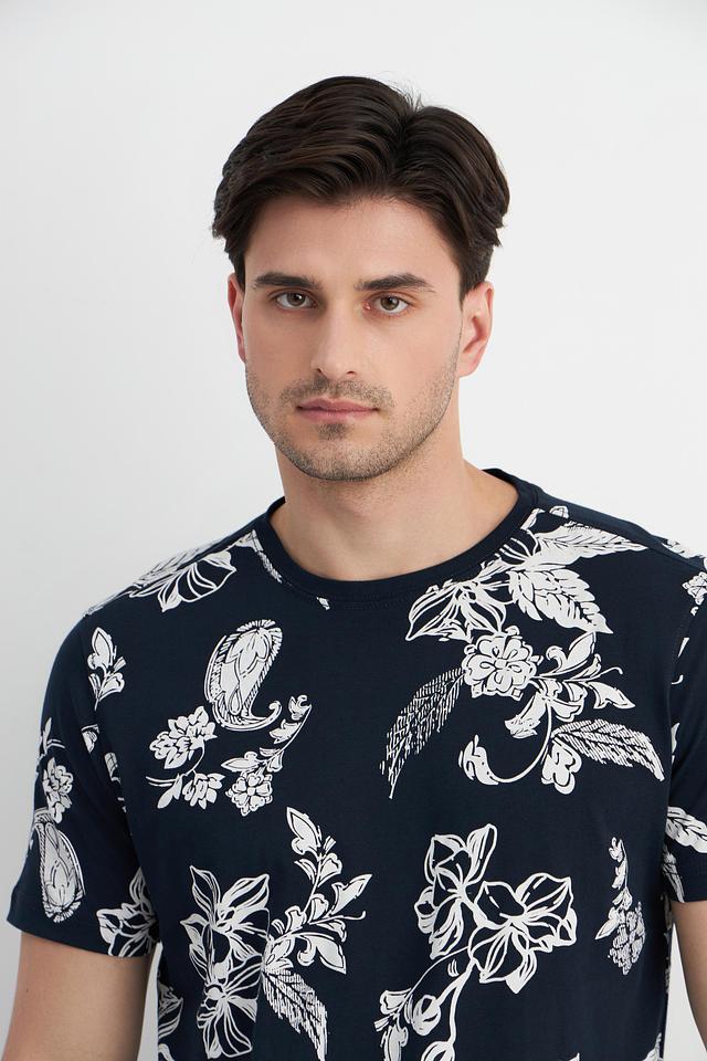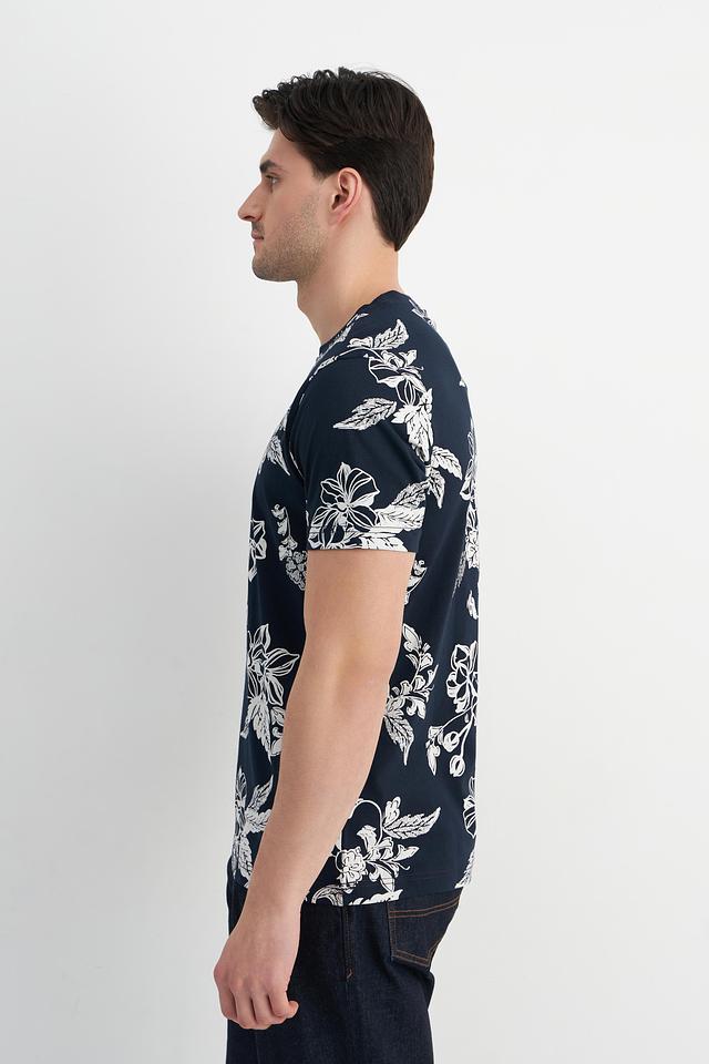 Основной цвет футболки – глубокий темно-синий, который служит идеальным фоном для яркого и детализированного цветочного принта. Рисунок выполнен в белых и светло-серых тонах, создавая контрастный и привлекательный образ.