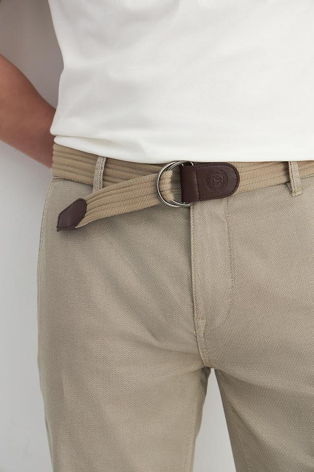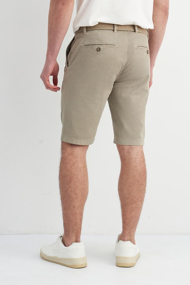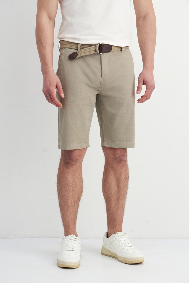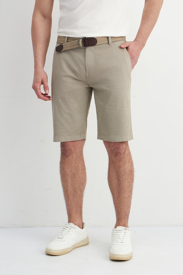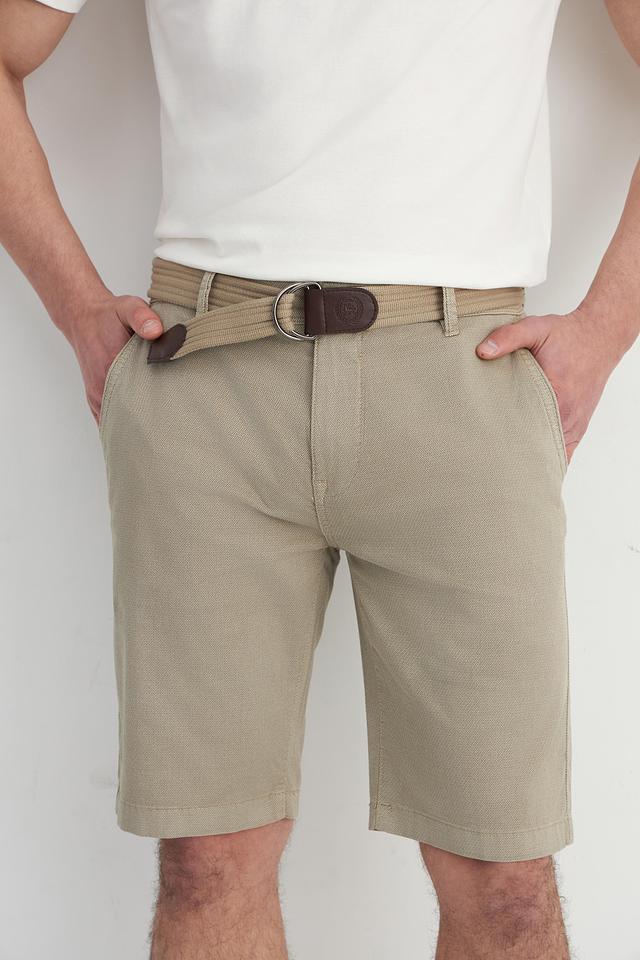 Шорты имеют классический крой, обеспечивающий свободу движений и комфортную посадку. Пояс дополнен текстильным ремнем с кожаной пряжкой, что позволяет регулировать посадку и добавляет стильный акцент.