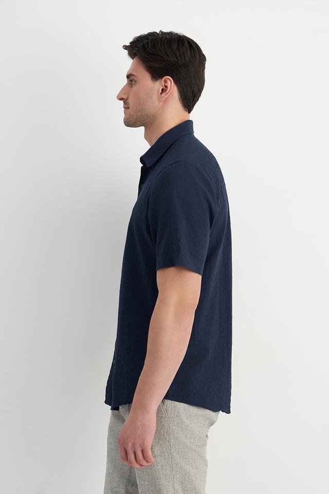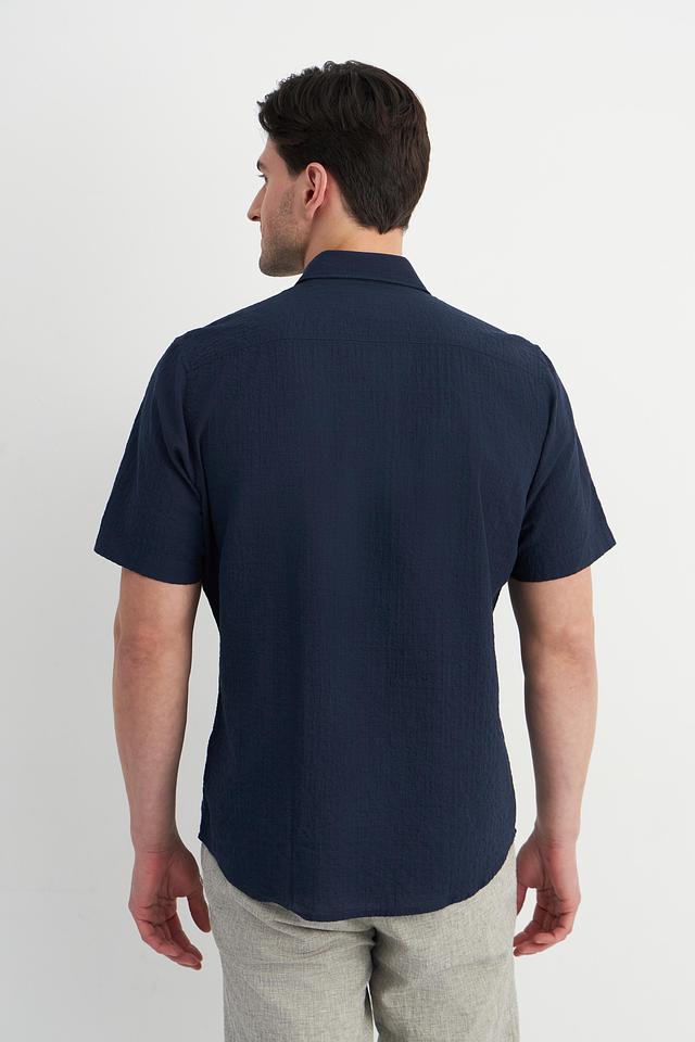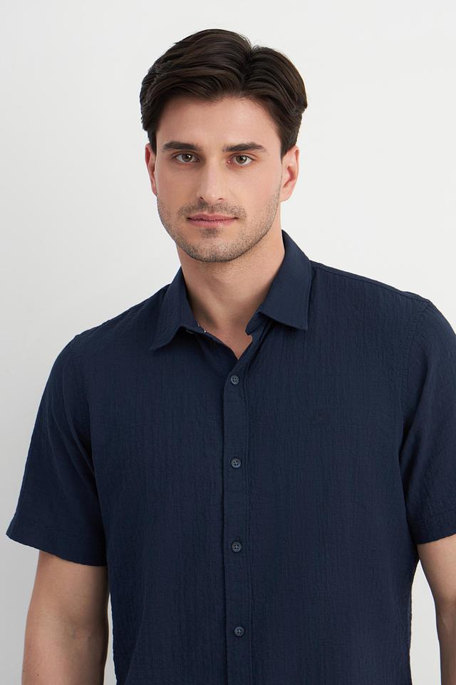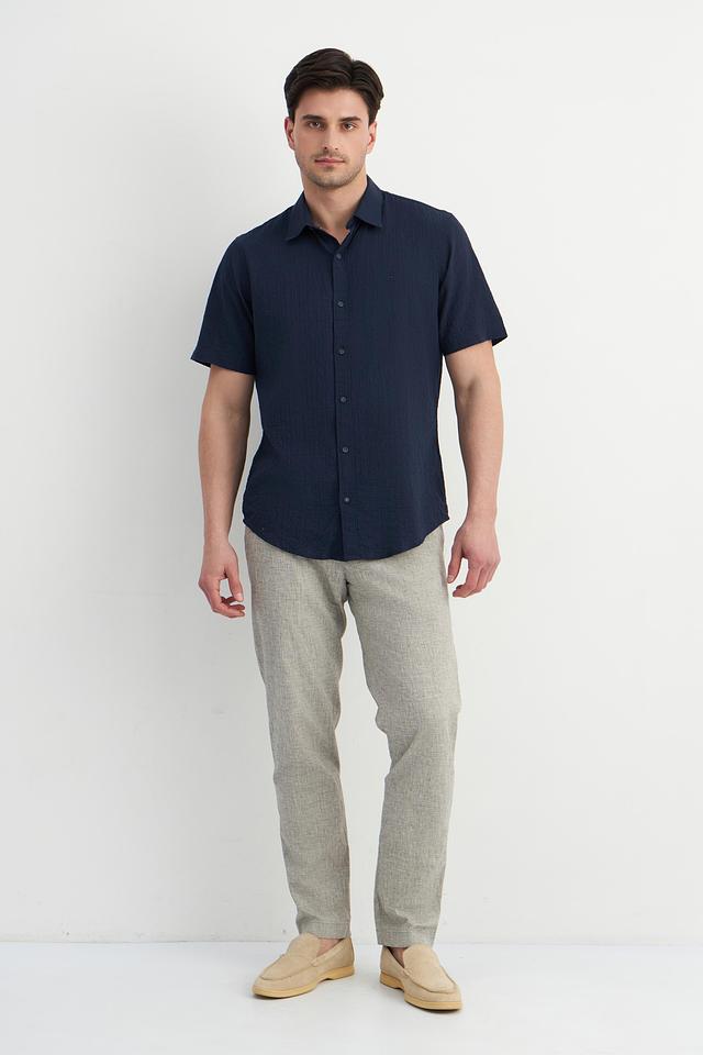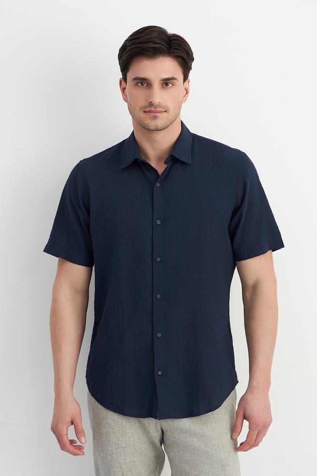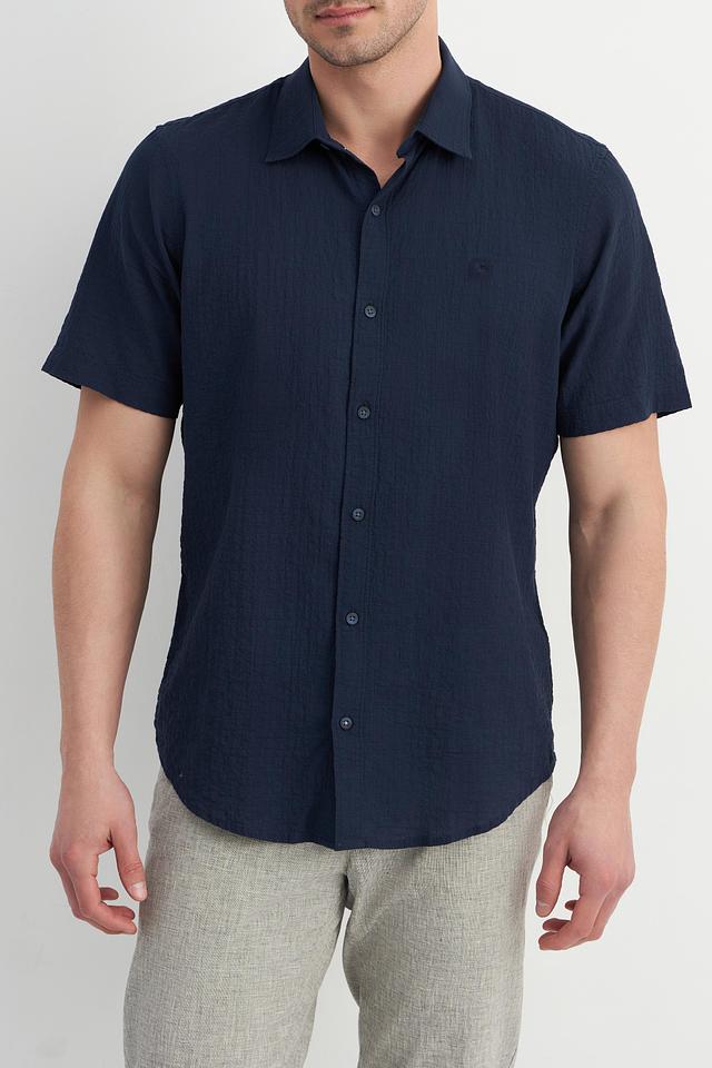 Рубашка имеет короткий рукав и классический крой, обеспечивающий свободу движений. Особый акцент сделан на яркой вышивке, которая проходит по краям изделия – воротнику, планке и манжетам. Эта деталь придает рубашке индивидуальность и оригинальность.