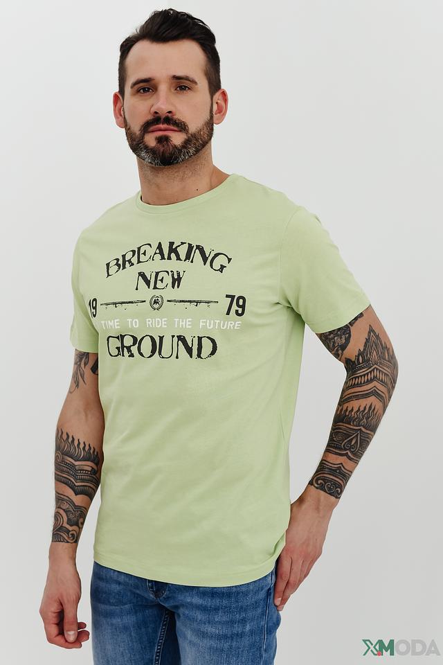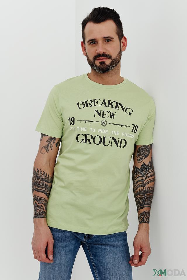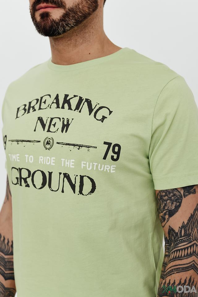 Особенностью данной модели является яркий принт с надписью "BREAKING NEW GROUND" и графическими элементами, который подчеркнет вашу индивидуальность. Классический крой и короткий рукав обеспечивают свободу движений и комфорт в течение всего дня.