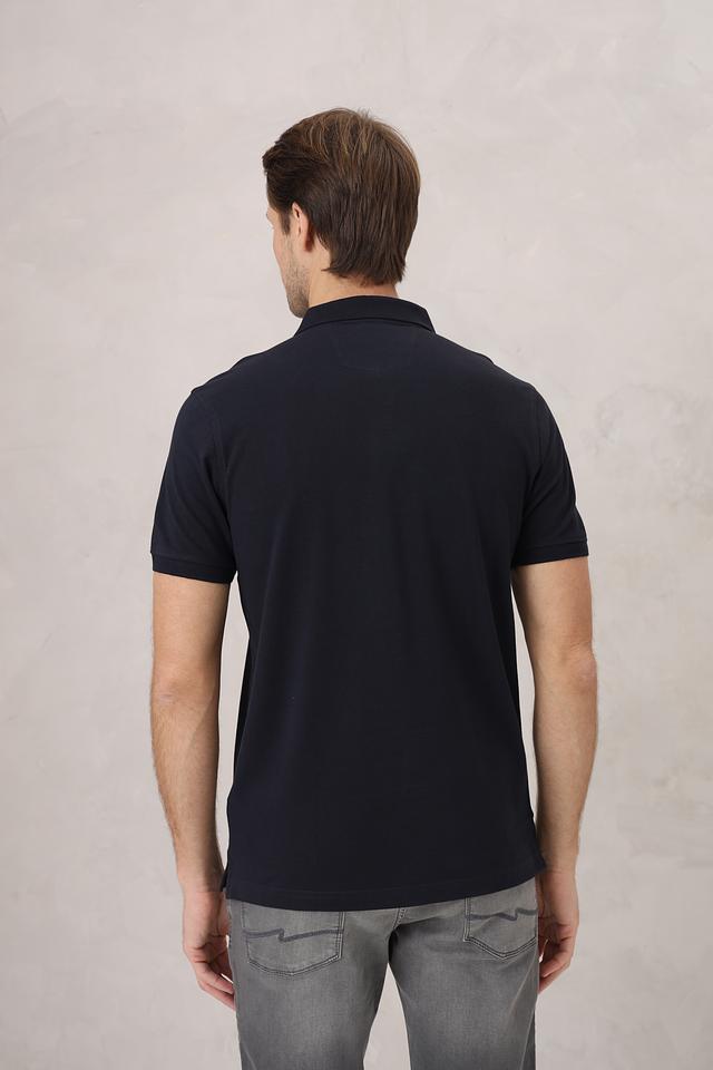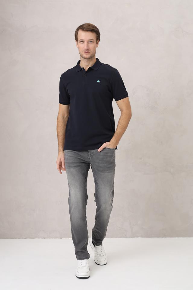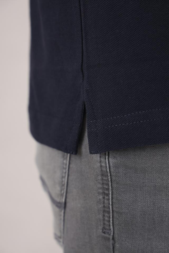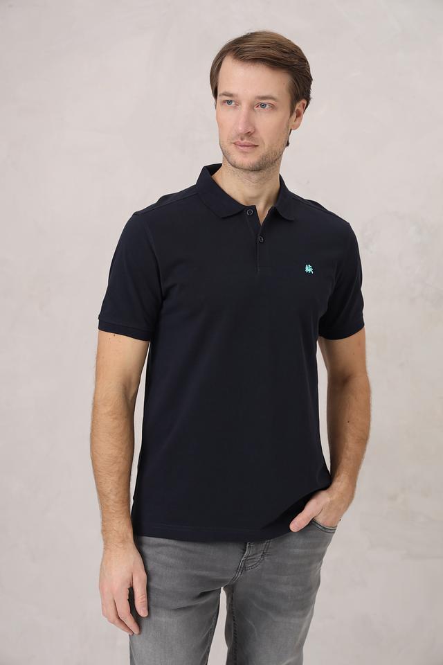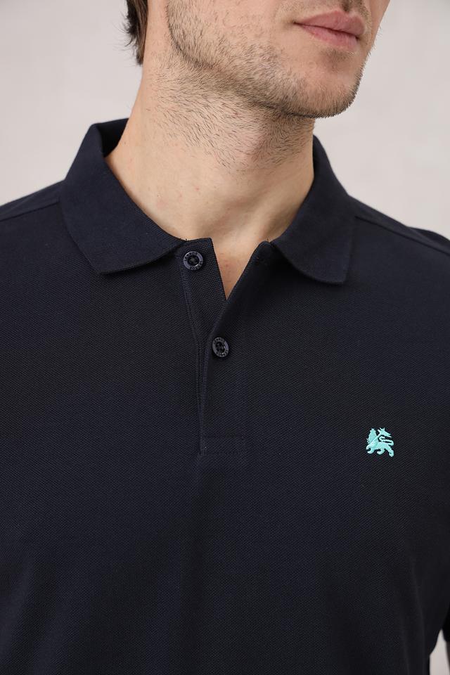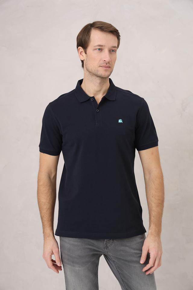 Тёмно-синий цвет делает эту модель универсальной и легко сочетаемой с различными элементами гардероба. Воротник поло выполнен из эластичного трикотажа, что обеспечивает удобную посадку по фигуре. На груди расположена небольшая вышивка с логотипом бренда, добавляющая изделию индивидуальности.
