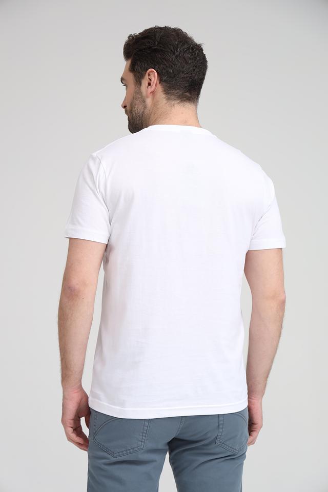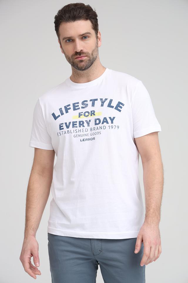 Основным элементом дизайна является яркий принт "Lifestyle for Every Day", выполненный в сине-бежевой гамме. Принт добавляет образу индивидуальность и динамичность. Крой футболки – классический, прямой, что делает ее универсальной и подходящей для разных типов фигуры.