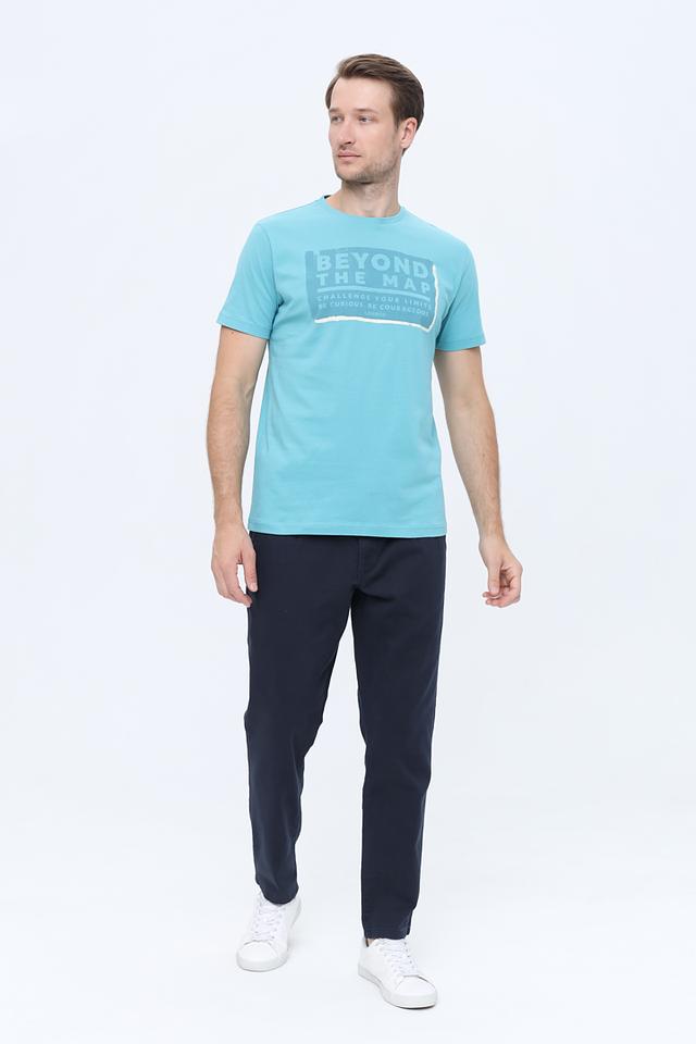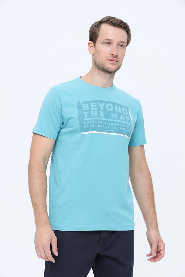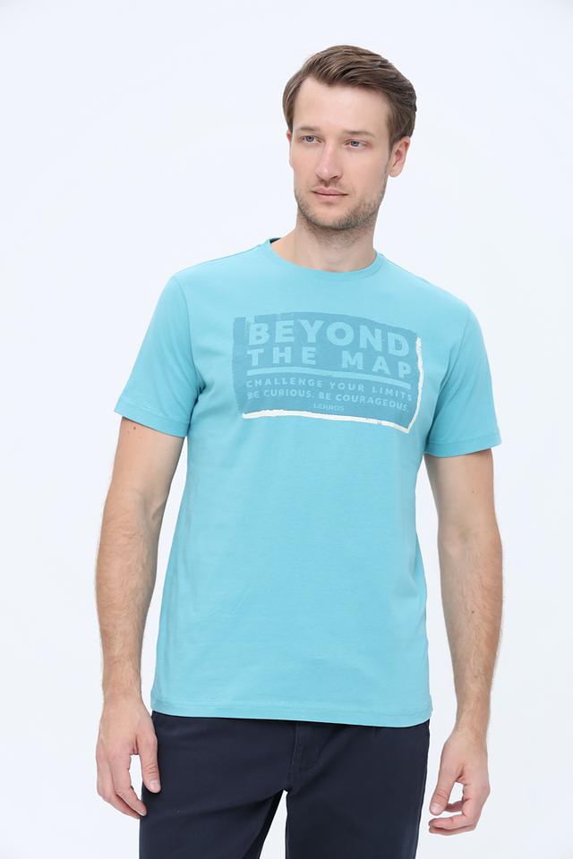 Футболка имеет классический крой и короткий рукав. Основной цвет – бирюзовый, который отлично подходит для летнего сезона. На передней части футболки расположен яркий принт с надписью "BEYOND THE MAP", выполненный в контрастных тонах.