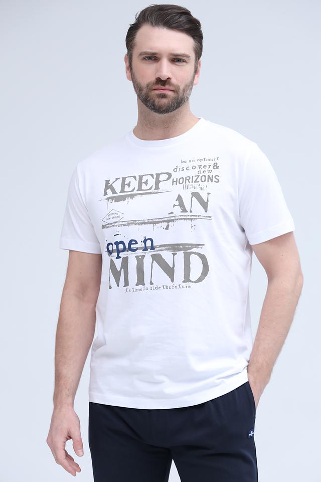 Основным элементом дизайна является яркий принт на лицевой стороне, выполненный в серо-чёрной гамме. Принт содержит надпись "KEEP AN OPEN MIND" и графические элементы, придающие футболке индивидуальность.