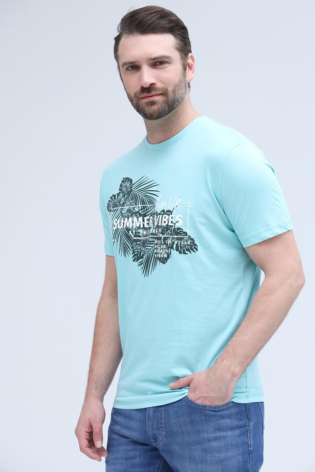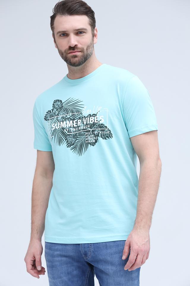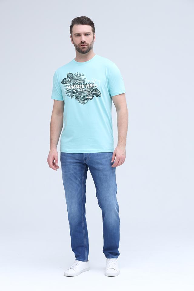 Эта футболка от Lerros станет стильным дополнением к вашему образу. Она выполнена в приятном бирюзовом цвете и украшена эффектным принтом с изображением тропических листьев и надписью "SUMMER VIBES".
