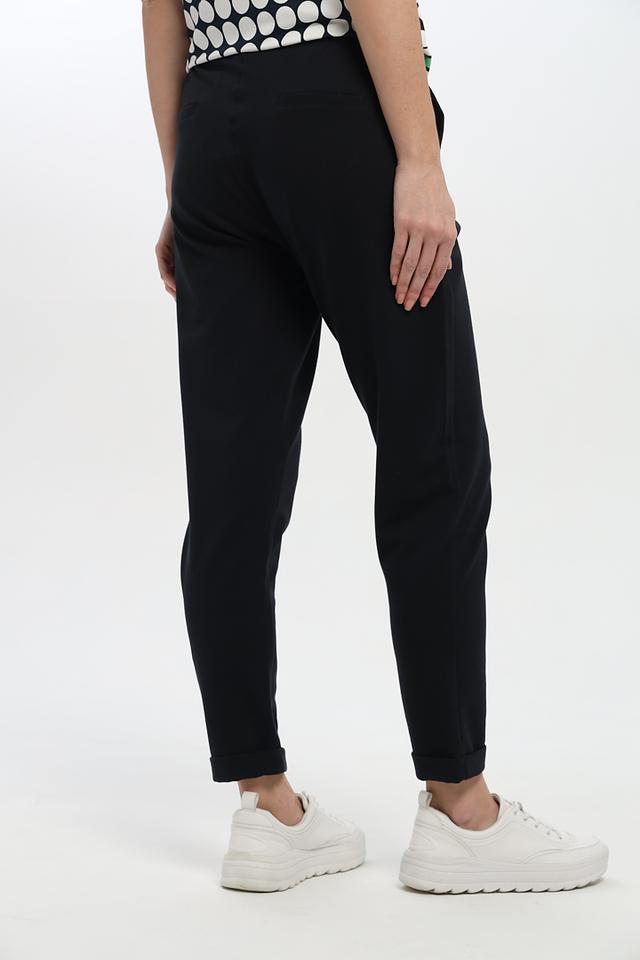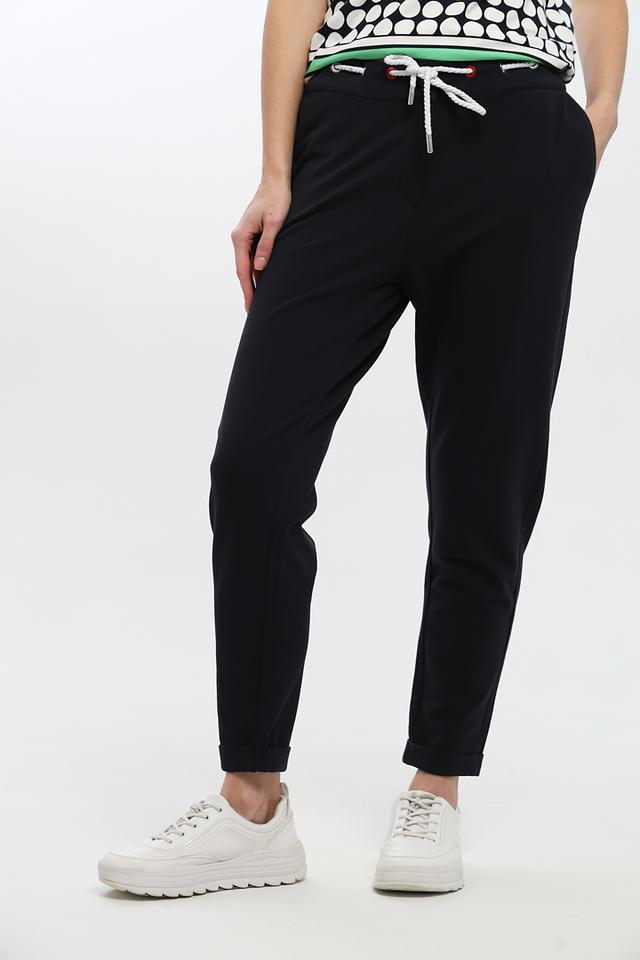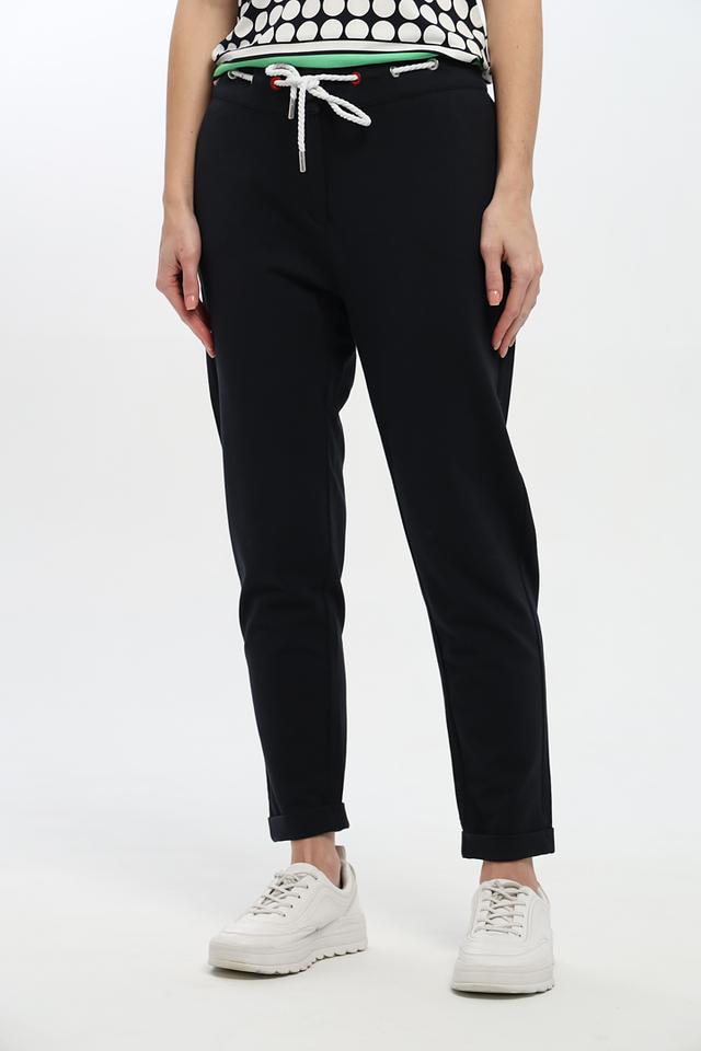 Брюки имеют зауженный крой, который подчеркивает фигуру, и удобный пояс на эластичной резинке с регулируемым шнурком. Декоративный шнурок добавляет образу непринужденности и стиля.