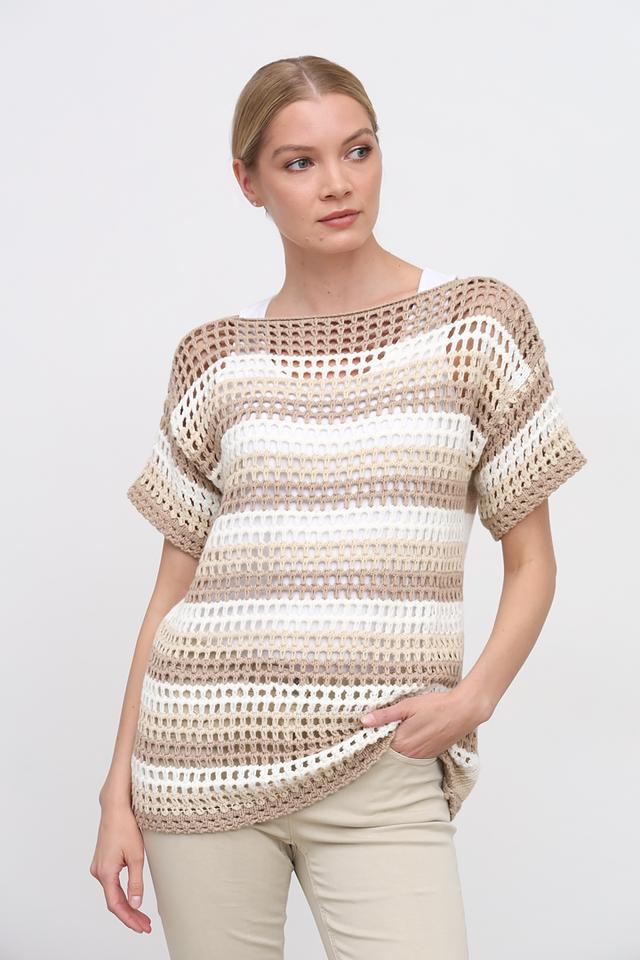 Женский пуловер Lisa Campione бежевого цвета с короткими рукавами выполнен в полоску. Модель имеет свободный крой и ажурную вязку, что делает ее легкой и воздушной. Состав: хлопок 50%, акрил 50%