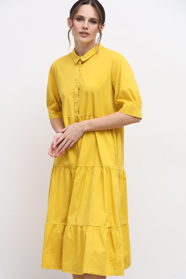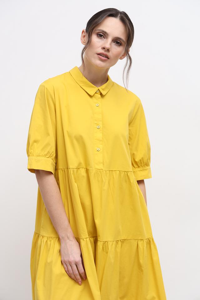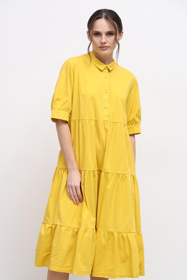Жёлтое платье от Lisa Campione – это стильное и комфортное решение для летнего гардероба. Модель выполнена из хлопка со спандексом, имеет рубашечный крой, воротник и многоярусную юбку с оборками. Состав: хлопок 97%, спандекс 3%