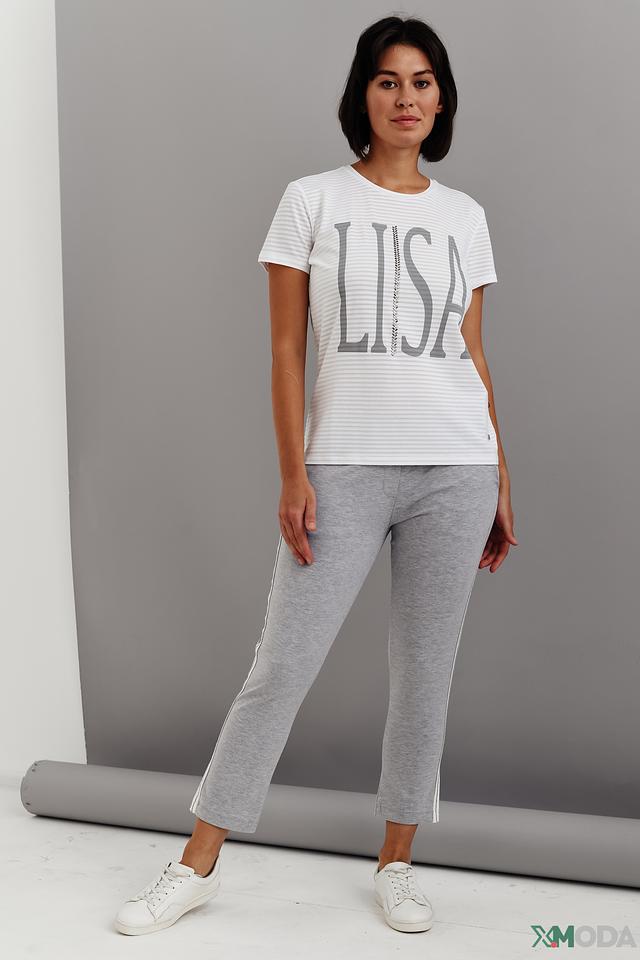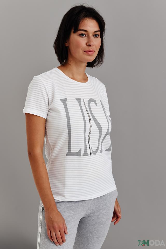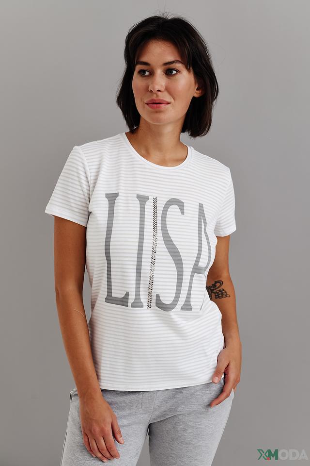 На груди расположена надпись "LISA" выполненная в сером цвете, что придает футболке узнаваемый и современный вид. Модель имеет круглый вырез горловины и короткие рукава, обеспечивающие комфорт в жаркую погоду.