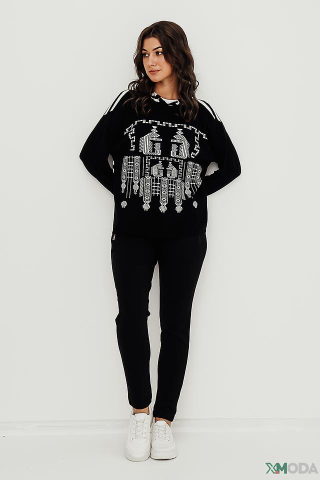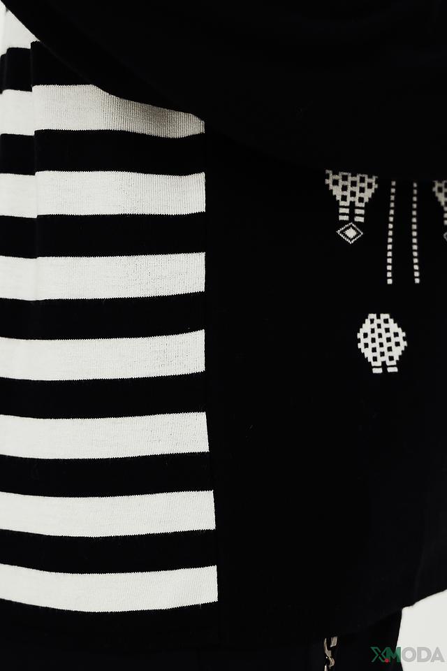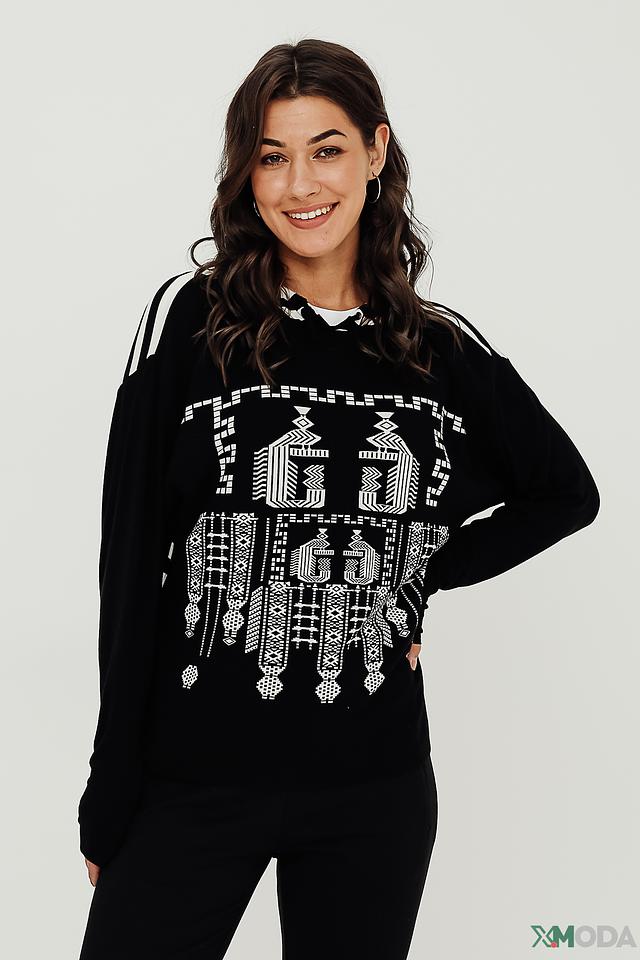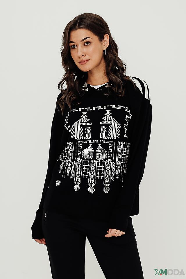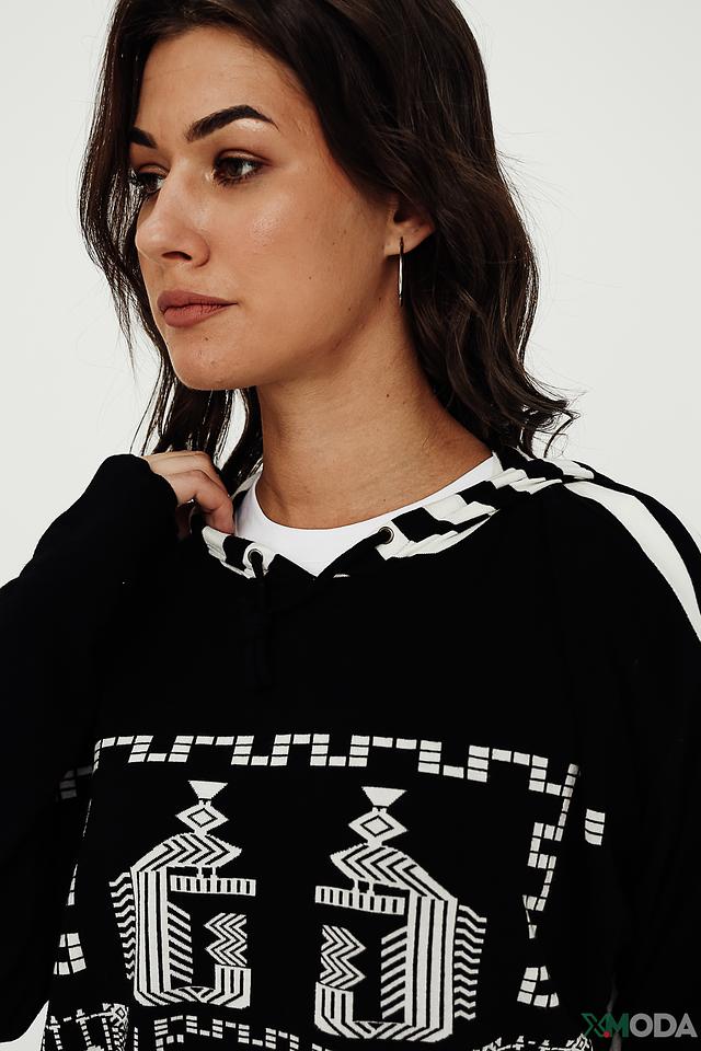 Чёрная толстовка Lisa Campione с оригинальным белым этническим принтом и полосками на рукавах. Модель выполнена из мягкой вискозы с добавлением эластана, обеспечивающего комфортную посадку. Состав: вискоза 95%, эластан 5%