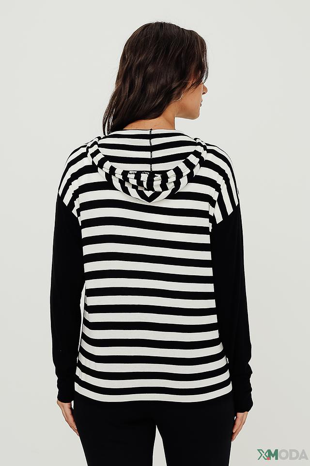Модель имеет удобный капюшон и длинные рукава, декорированные контрастными полосками. Толстовка изготовлена из высококачественной вискозы с добавлением эластана, что обеспечивает мягкость, приятные тактильные ощущения и хорошую посадку по фигуре.
