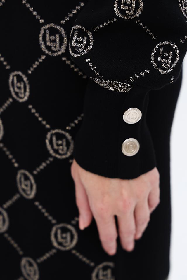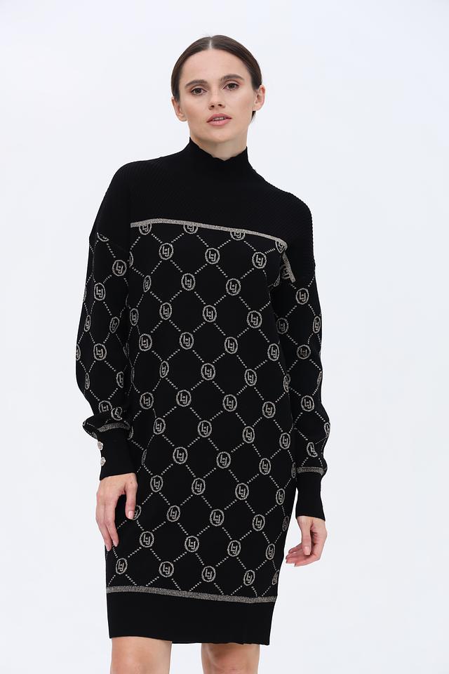 Платье имеет классический чёрный цвет, который легко сочетается с различными аксессуарами и обувью. Жаккардовый узор с логотипом бренда придает изделию изысканность и узнаваемость. Высокая горловина и длинные рукава делают платье подходящим для прохладной погоды.