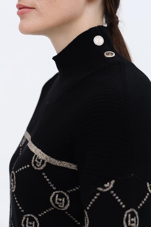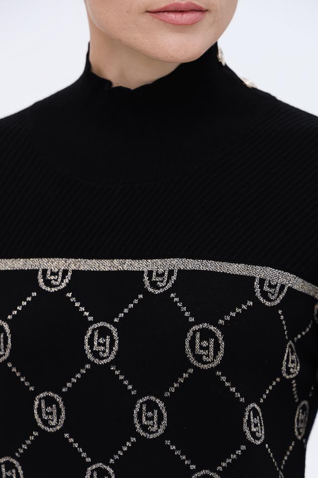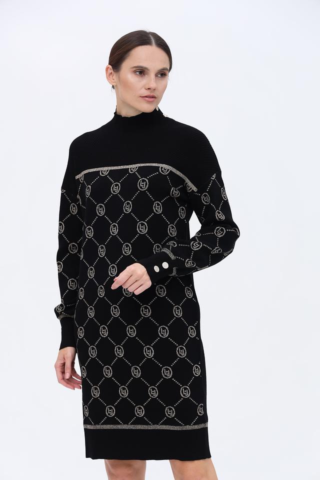 Чёрное платье от Liu-Jo выполнено из мягкого трикотажа с жаккардовым узором в виде логотипа бренда. Модель имеет приталенный силуэт, высокую горловину и длинные рукава с декоративными пуговицами. Состав: вискоза 53%, полиэстер 32%, полиамид 15%